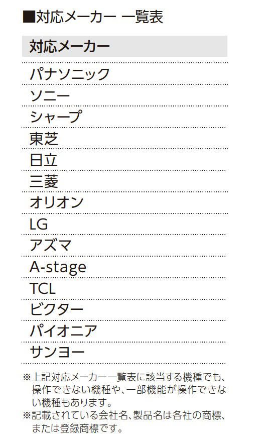 | 仕様2 | テレビリモコン:国内主要メーカー14社対応 |