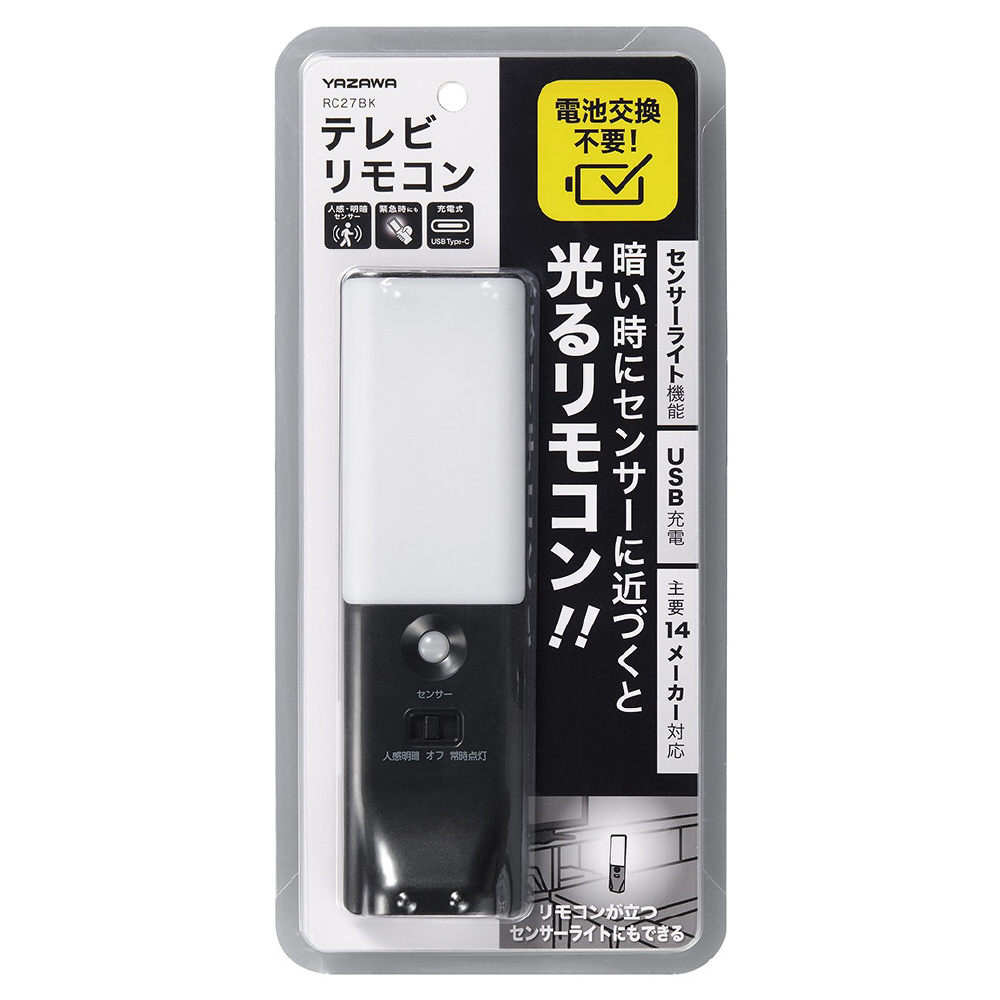 ナイトライトテレビリモコン ブラック RC27BK 国内主要メーカー14社対応 人感明暗センサー USB(Type-C)充電式で電池不要