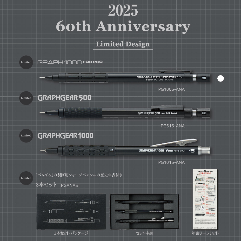 ぺんてるは、1965年にぺんてる初の製図用シャープペンシル「グラフペンシル」を発売して以来、多くの製図用シャープペンシルを生み出してきました。2025年のぺんてるの製図用シャープペンシル発売60周年を記念して、発売以来愛されてきたロングセラー商品である「グラフ1000〈フォープロ〉」「グラフギア500」「グラフギア1000」の3種の限定モデルを発売します。