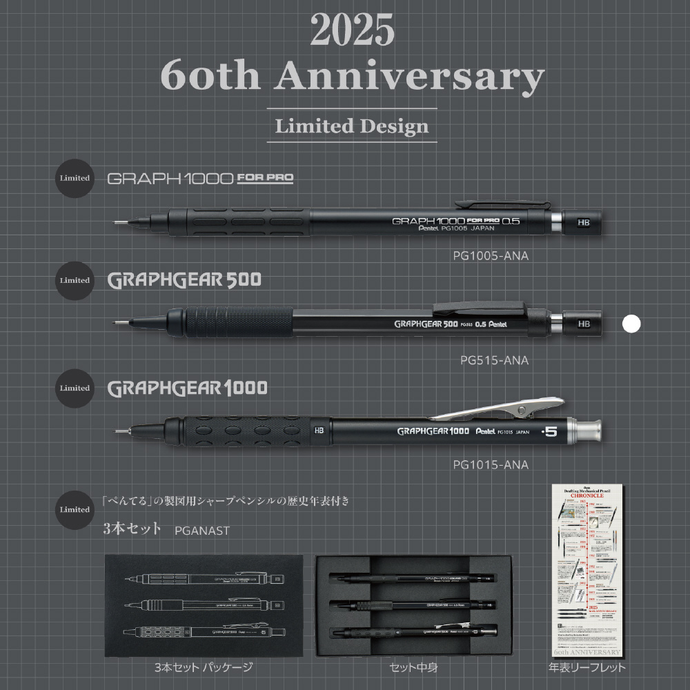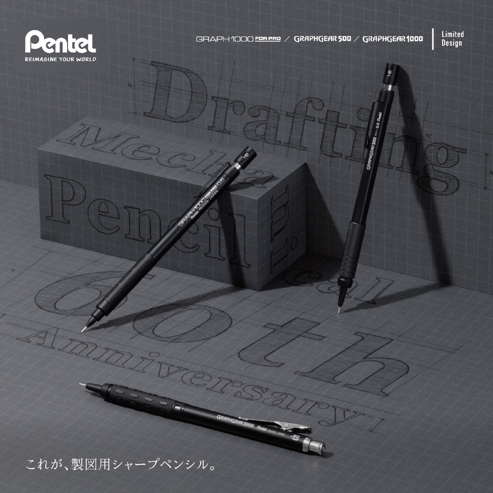 ぺんてるは、1965年にぺんてる初の製図用シャープペンシル「グラフペンシル」を発売して以来、多くの製図用シャープペンシルを生み出してきました。2025年のぺんてるの製図用シャープペンシル発売60周年を記念して、発売以来愛されてきたロングセラー商品である「グラフ1000〈フォープロ〉」「グラフギア500」「グラフギア1000」の3種の限定モデルを発売します。