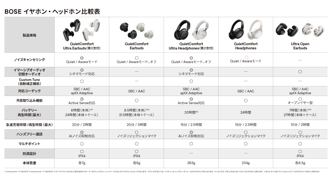 *2024年6月、ボーズでテスト実施。実製品のBose QuietComfort EarbudsとA2Dp Bluetoothオーディオを使用し、IEC60268-1ピンクノイズを再生しました。再生音量を75 dBSPL、3バンドEQをゼロに設定し、クワイエットモード (フルノイズキャンセリング) に設定しました。再生時間は最長8.5時間 (バッテリー切れになるまで再生)。バッテリー寿命は設定や使用状況によって異なります。