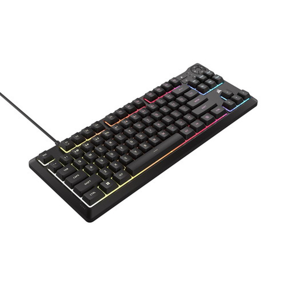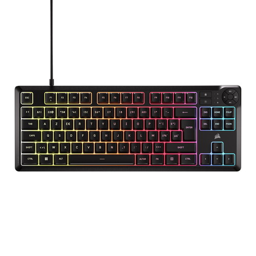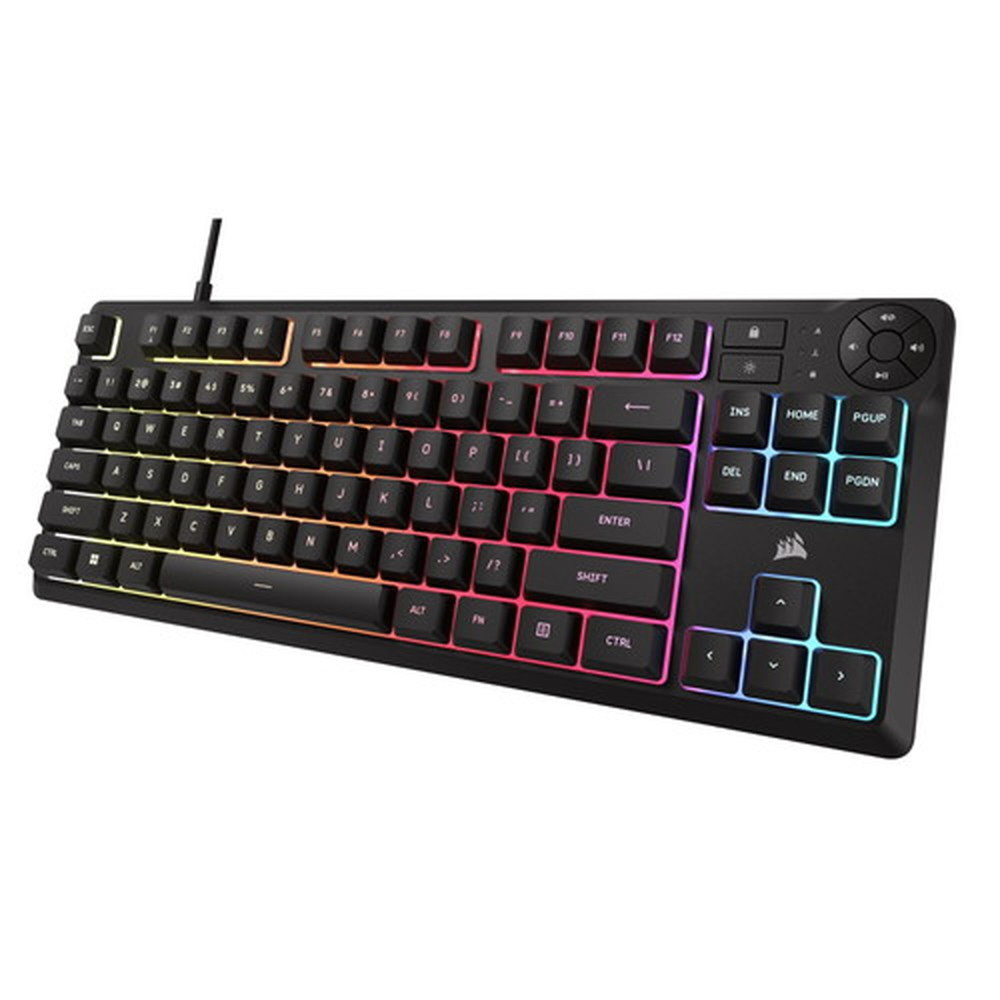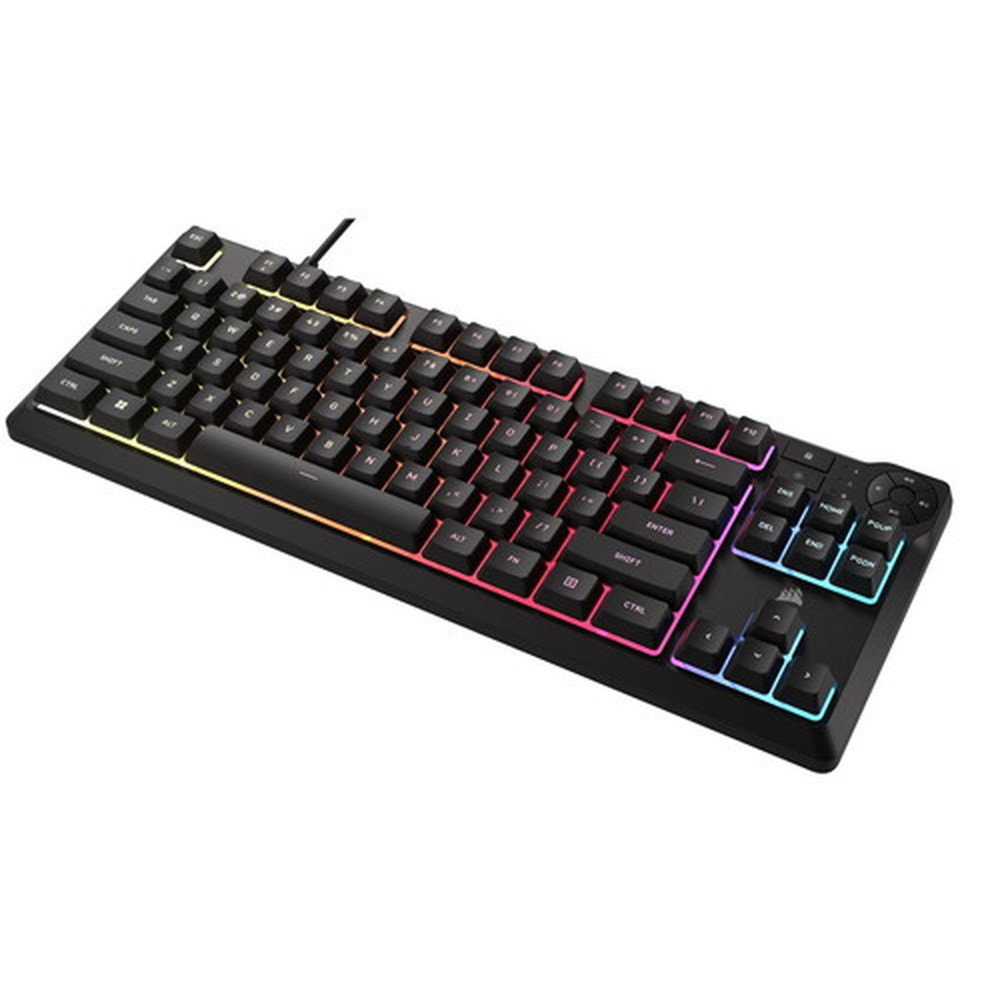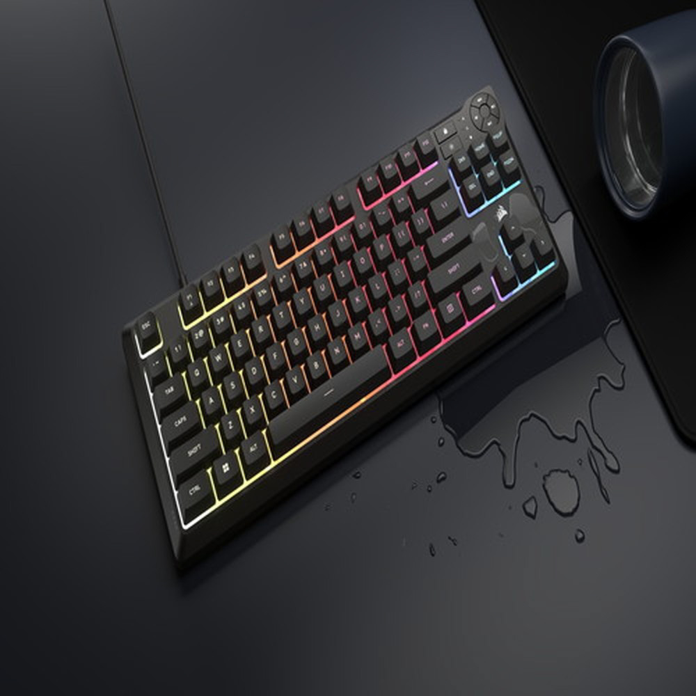 CORSAIR K55 CORE TKL ゲーミングキーボードは、防滴、省スペースでスタイリッシュなテンキーレスメンブレンキーボードで、プレイヤーにビッグプレーができるスペースを与えています。ささやき声のような静かさと反応性に優れたメンブレンキーでタイピングやゲーミングを楽しみ、専用のメディアコントロールボタンでいつでも操作できます。8 ゾーン RGB ライティングは、あなたのセンスに合わせてカスタマイズできます。