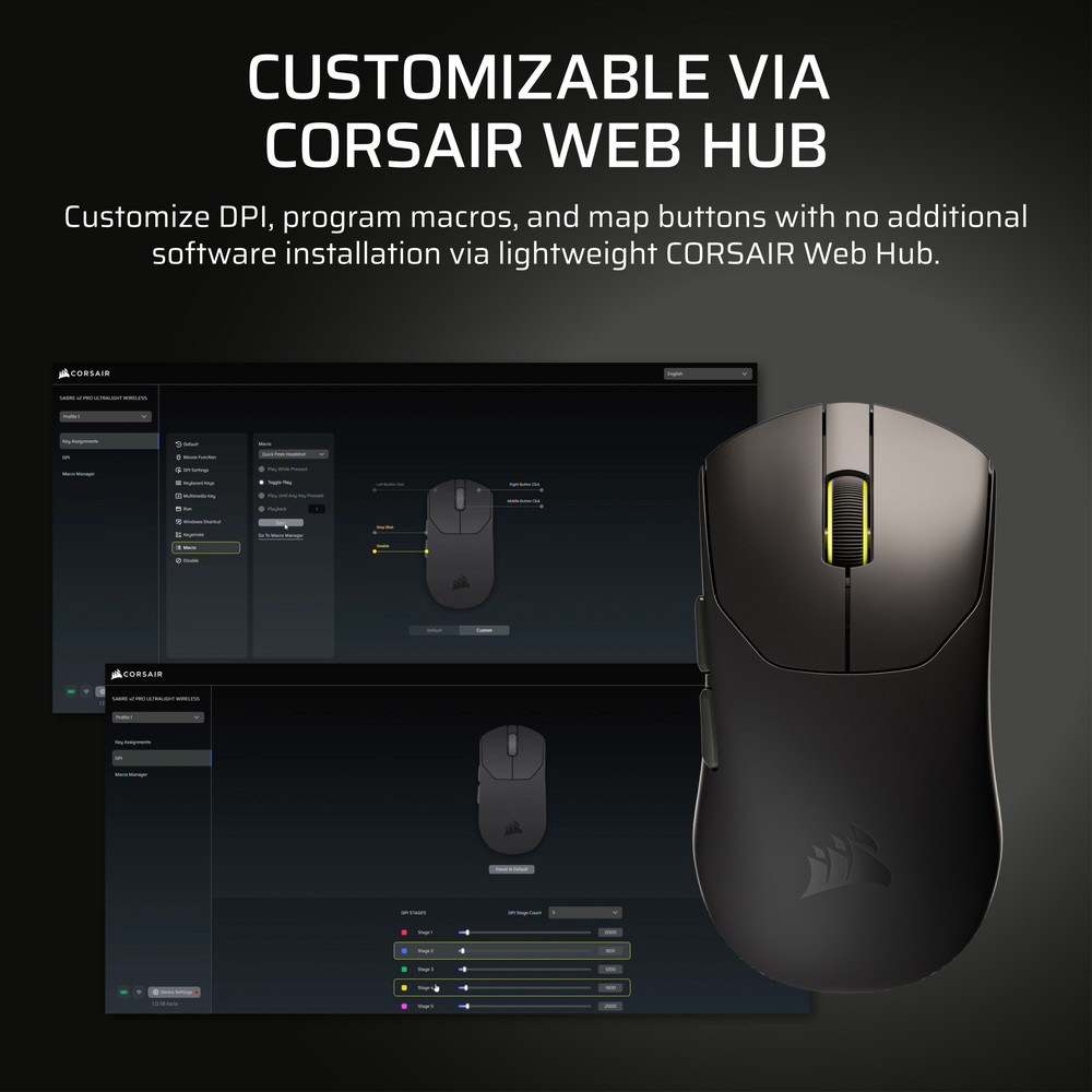 CORSAIR SABRE v2 PRO ウルトラライト ワイヤレス ゲーミング マウスは、36gの軽量設計、8000Hzのハイパーポーリング、33K DPIの光学式センサーを搭載し、プロレベルの速度と精度を実現しています。70時間のバッテリー寿命、カスタムチューンドスイッチ、CORSAIR Web Hubを介した軽量カスタマイズなど、プロプレイに対応するフルスペックを備えている。