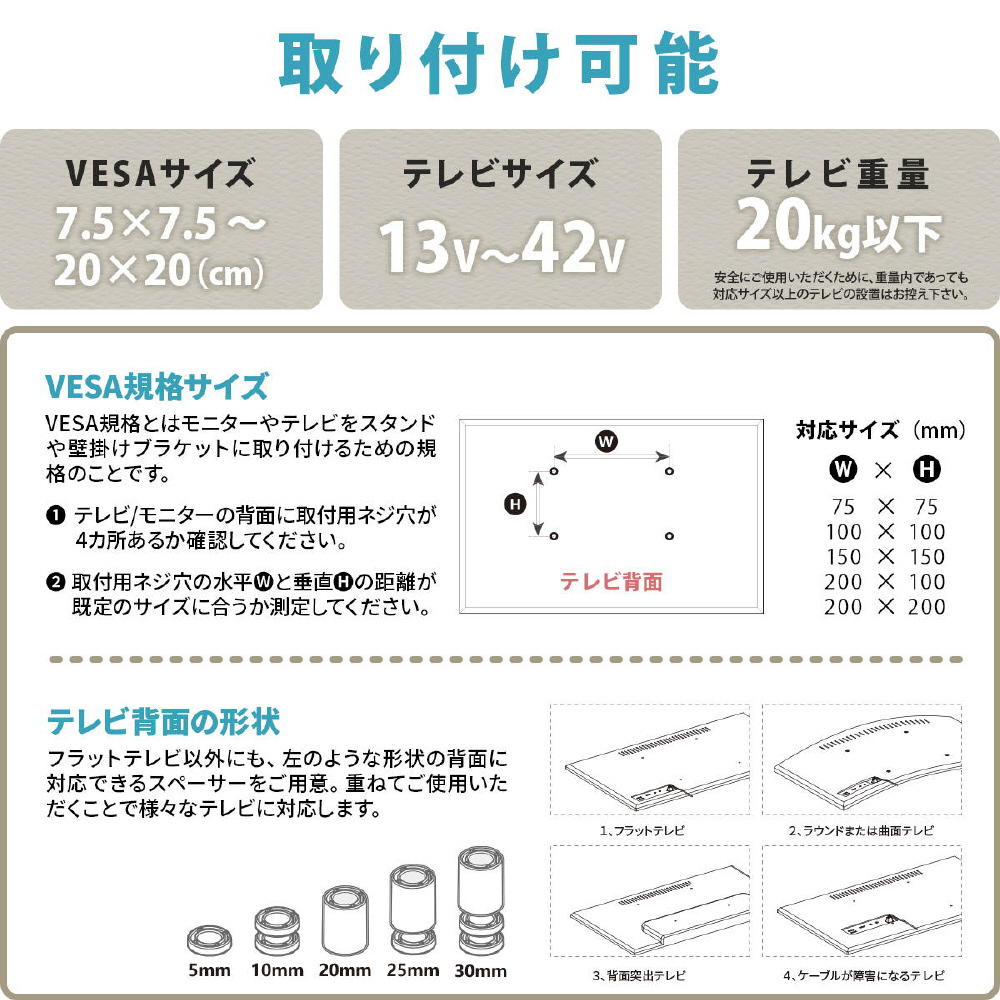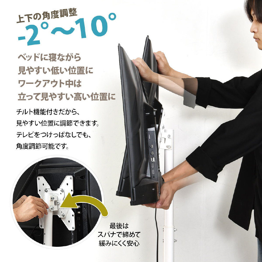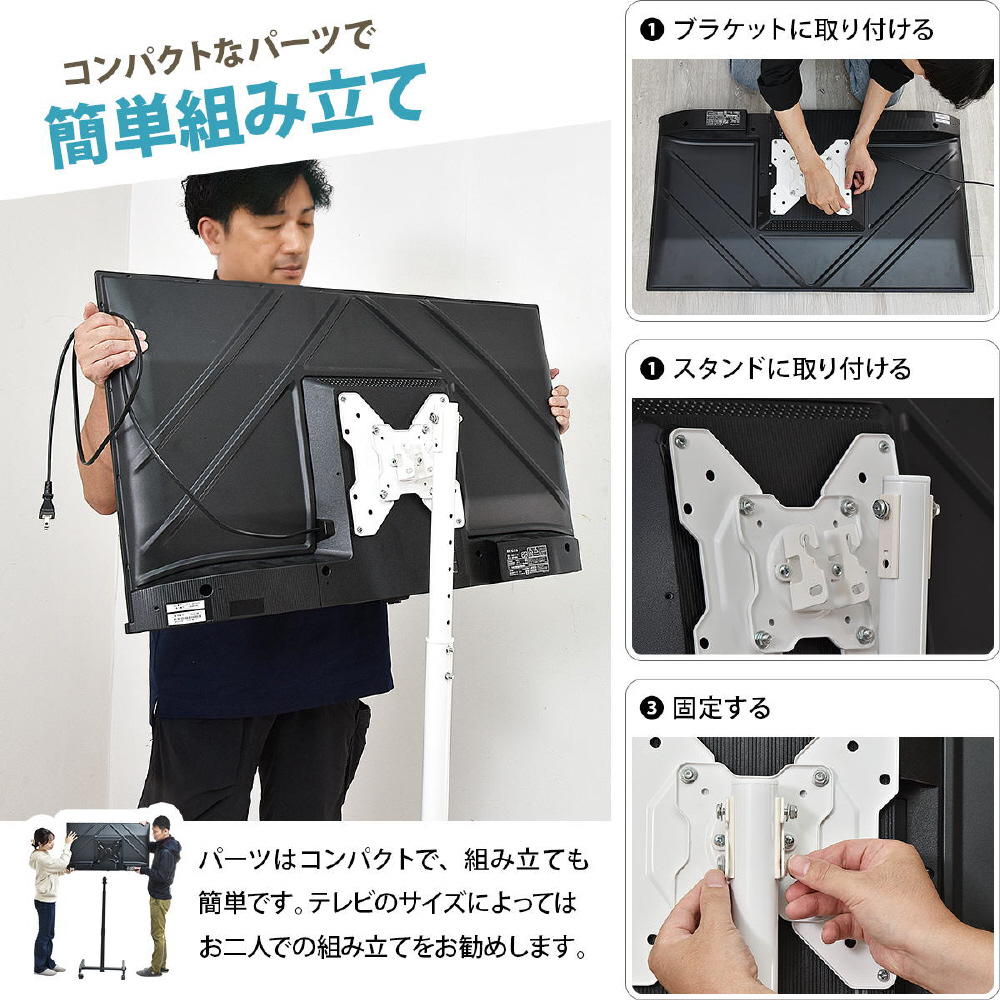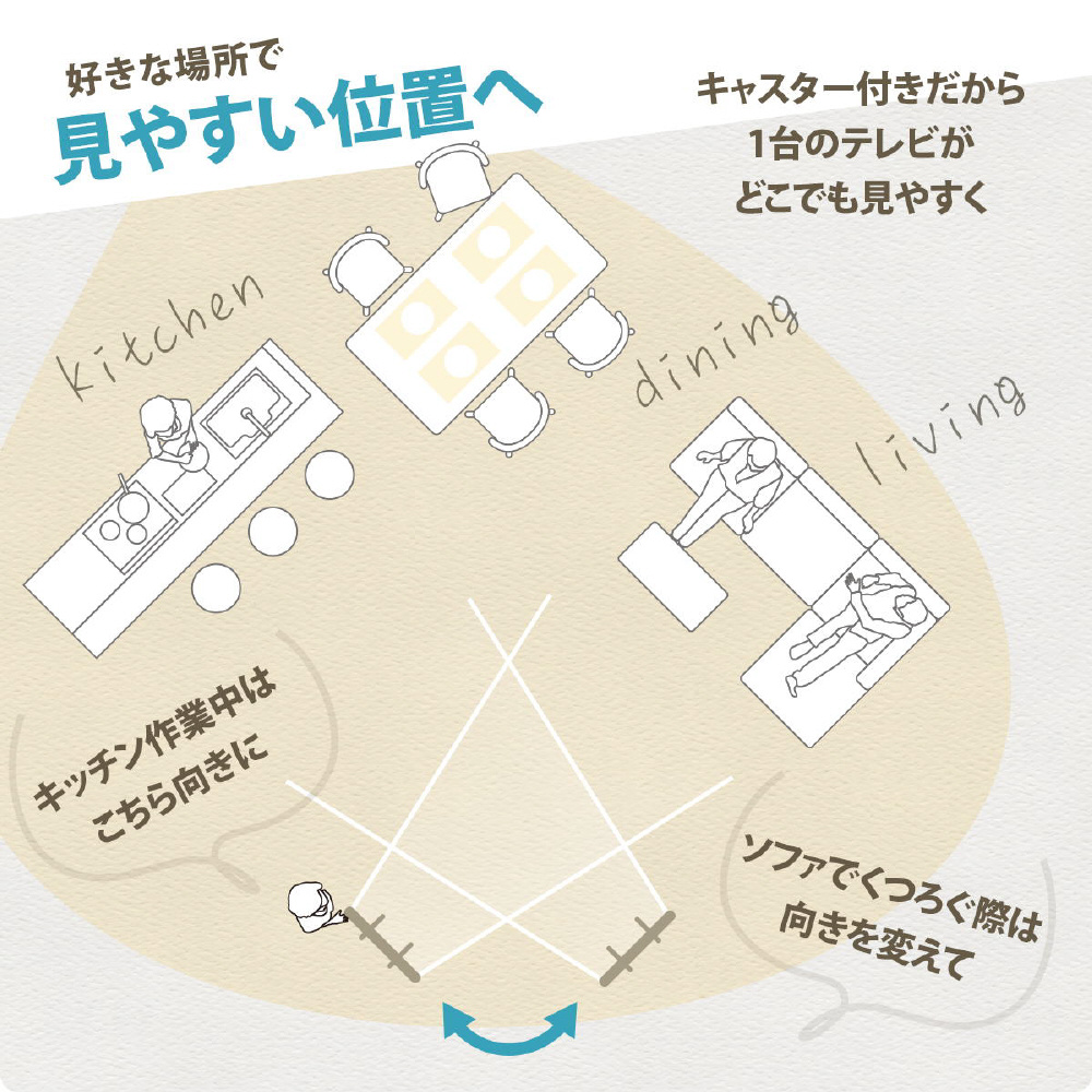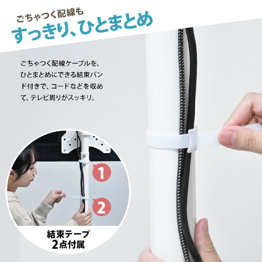 13〜42型までのテレビに対応した、本体耐荷重20kgのスタンドです。高さが3段階に調節できるうえに、キャスターもついていて簡単に移動可能。キャスターがあれば簡単に移動ができ、オフィスや学校、寝室などでサッとテレビスタンドを移動させられるのはもちろん、テレビスタンド近辺を掃除したいときにも役立ちます。