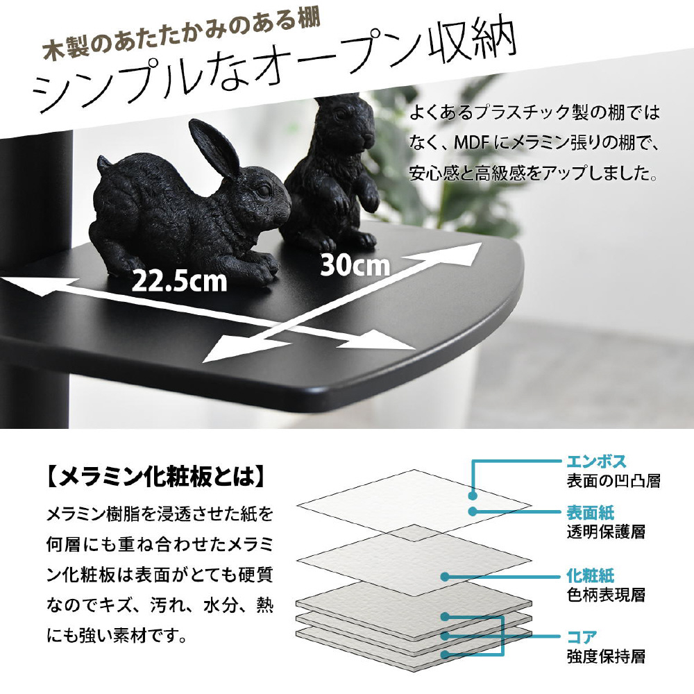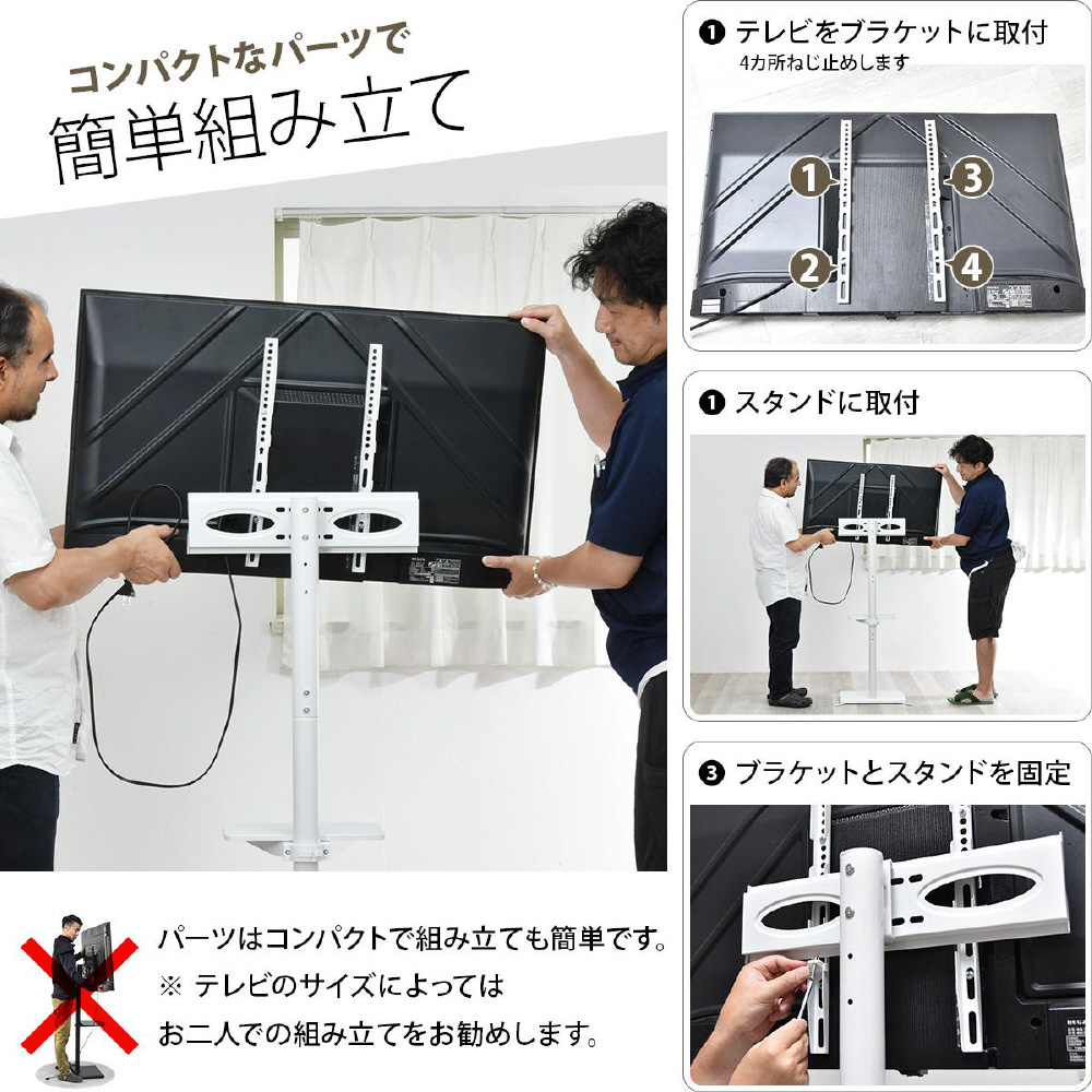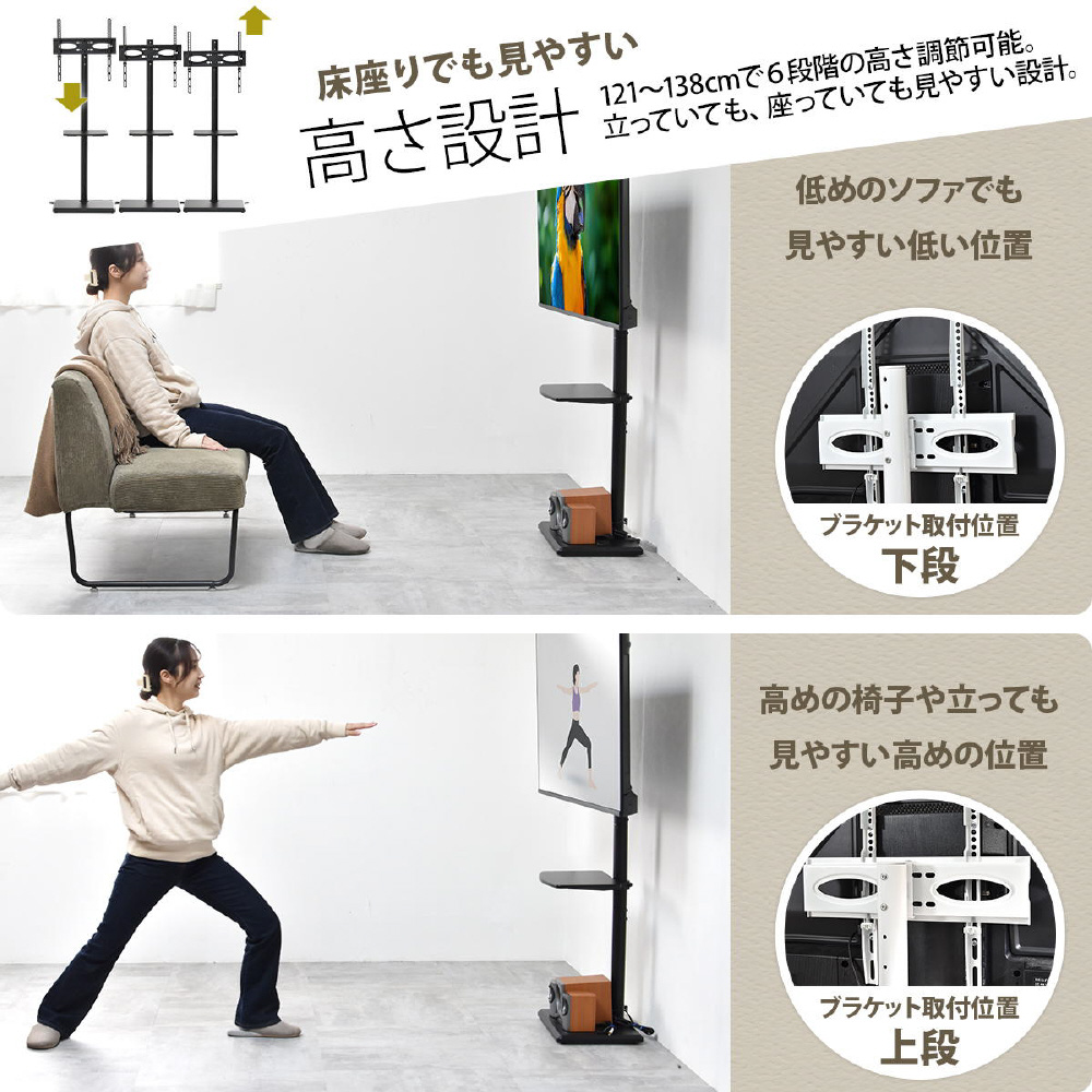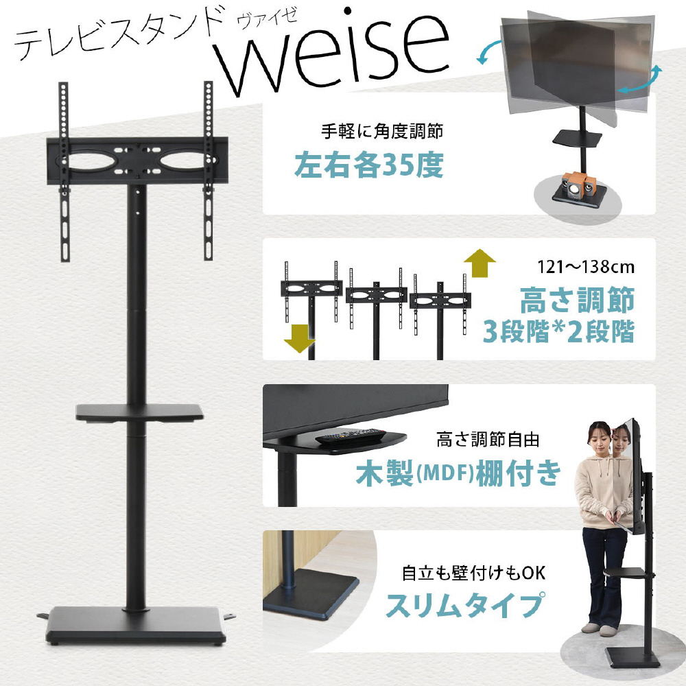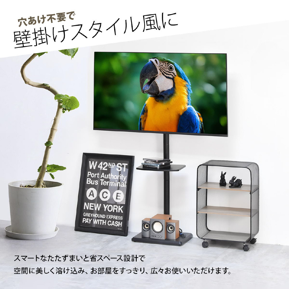 32〜55型までのテレビに対応した、本体耐荷重30kgの壁寄せタイプの棚付きテレビスタンド。テレビスタンドのメリットは、空間を広く使え、省スペースで設置できるので土台が邪魔になりにくく、部屋の圧迫感が減少されます。コーナー・壁寄せ問わず、いろいろな場所にフレキシブルに設置できるので、好みのレイアウトを楽しめるのも大きなメリット。木製の棚板もついていますので、レコーダーなの機器も置くことができます。