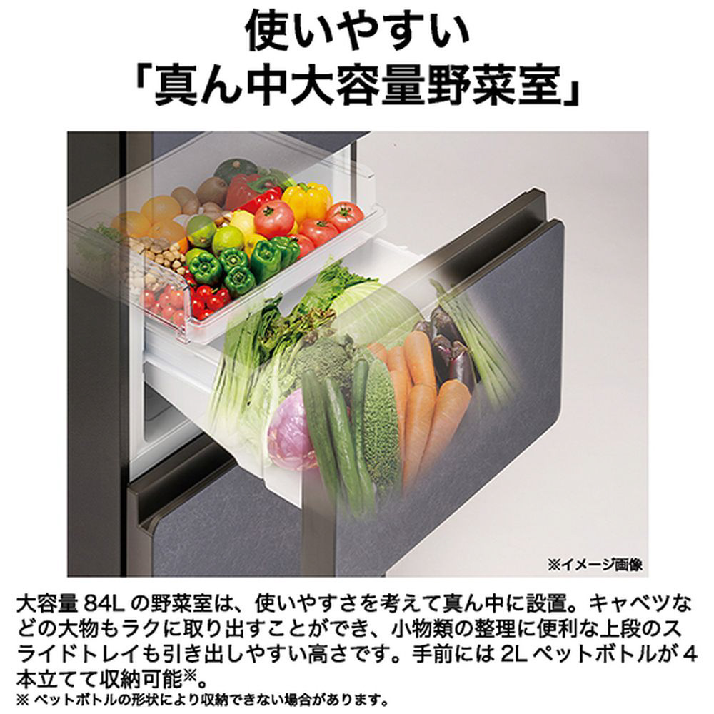 大容量84Lの野菜室は、使いやすさを考えて真ん中に設置。キャベツなどの大物もラクに取り出すことができ、小物類の整理に便利な上段のスライドトレイも引き出しやすい高さです。手前には2Lペットボトルが4本立てて収納可能※1。