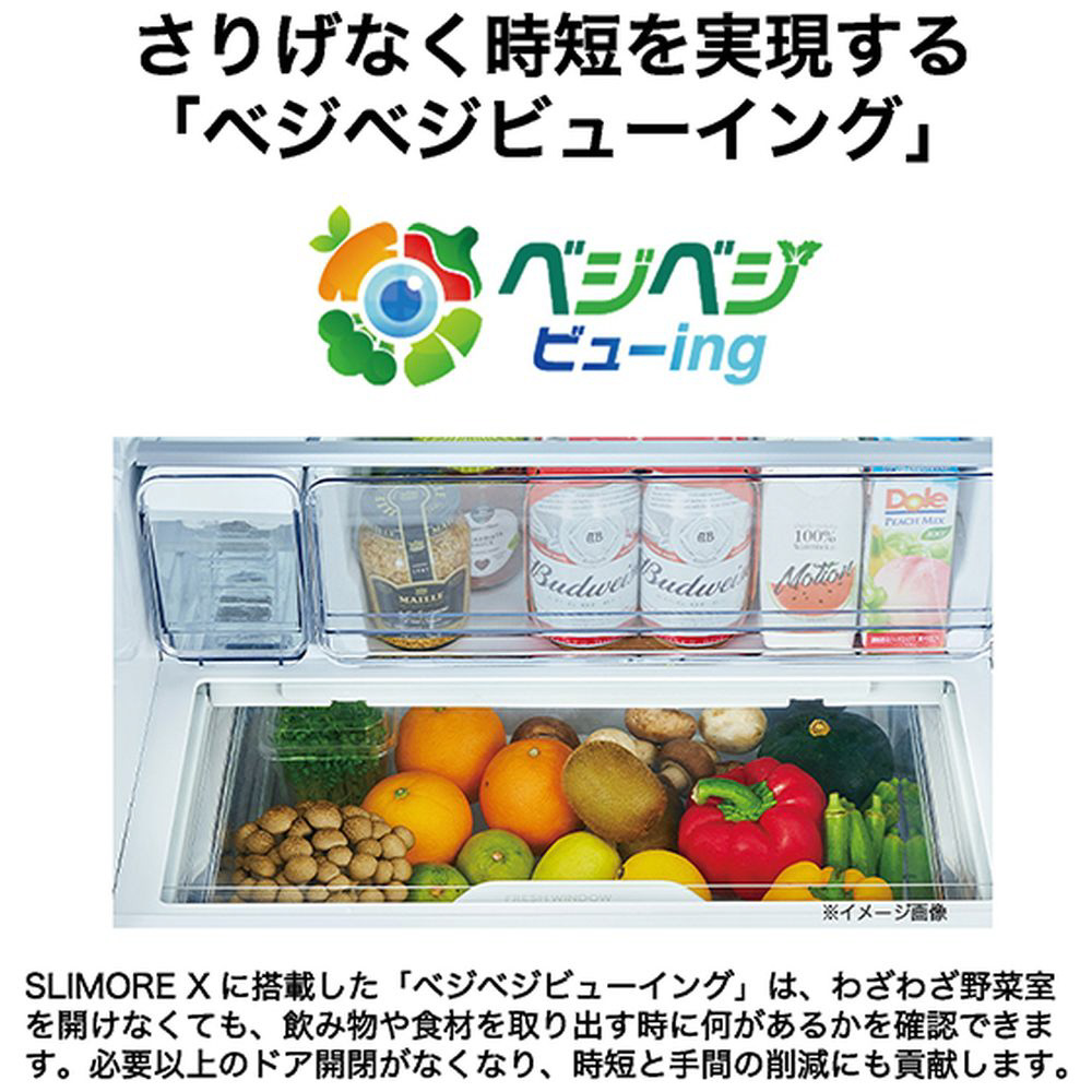 SLIMORE Xに搭載した「ベジベジビューイング」は、わざわざ野菜室を開けなくても、飲み物や食材を取り出す時に何があるかを確認できます。必要以上のドア開閉がなくなり、時短と手間の削減にも貢献します。