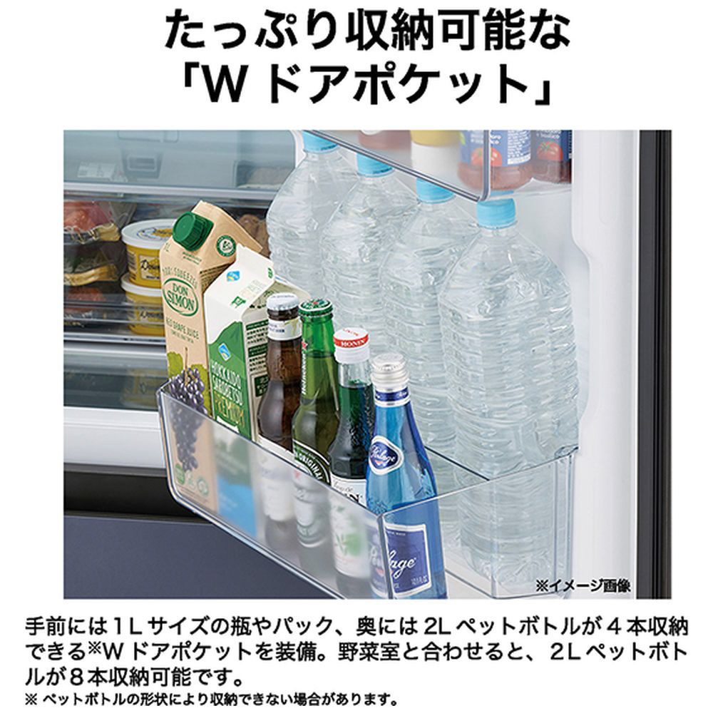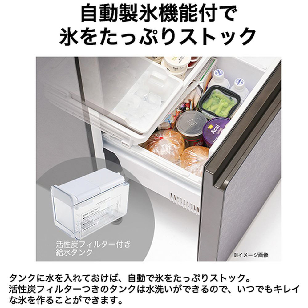 | 付属品 | 卵ケース(1)、フリーポケット(1)、ボトルポケット(1)、冷蔵室棚(4:ノーマル2+ハーフ2)、変温ケース(フレッシュルーム)、小物野菜トレイ(1)、野菜ケース(1)、アイスボックス(1)、冷凍トレイ(1)、冷凍バスケット(1)、氷スコップ(1) |