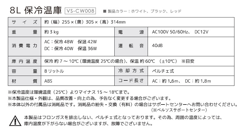 | 商品名 | VS-CW008BK ポータブル冷温庫 8L ベルソス ブラック |
