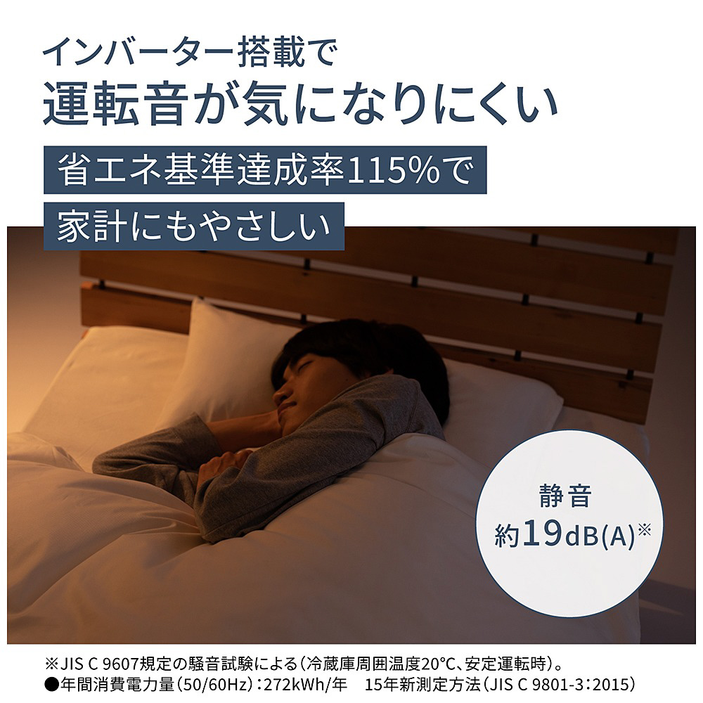 運転音が気になりにくい、約19dB(A)※1の静音化設計。ひとり暮らしにはもちろん、2台目冷蔵庫にもおすすめです。