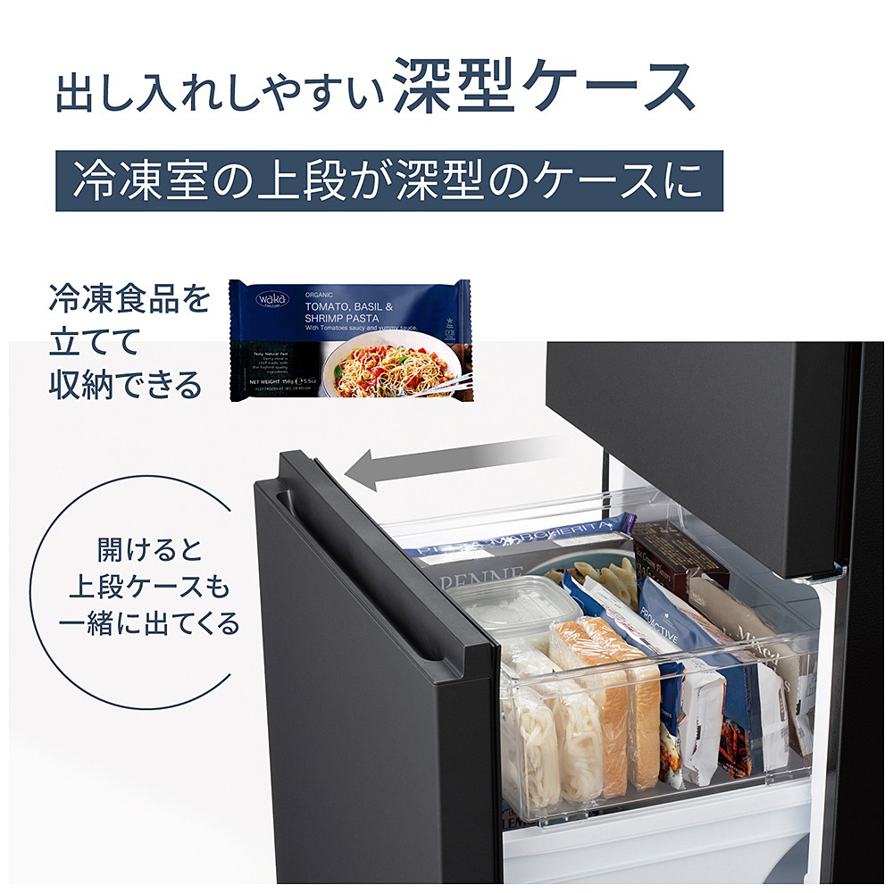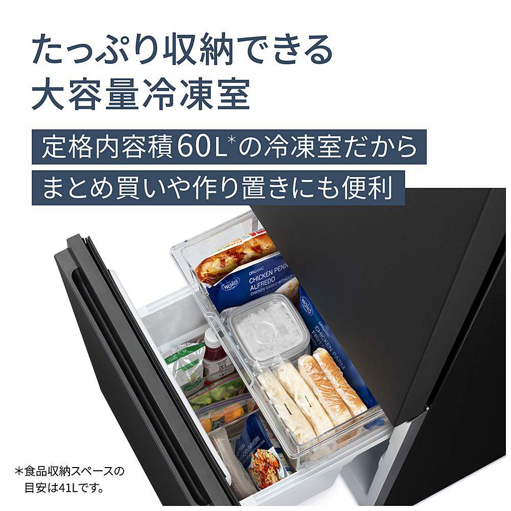 冷凍室の定格内容積は60L〈食品収納スペース41L〉と大容量。冷凍食品のまとめ買いや作り置きなど、たっぷり収納できます。