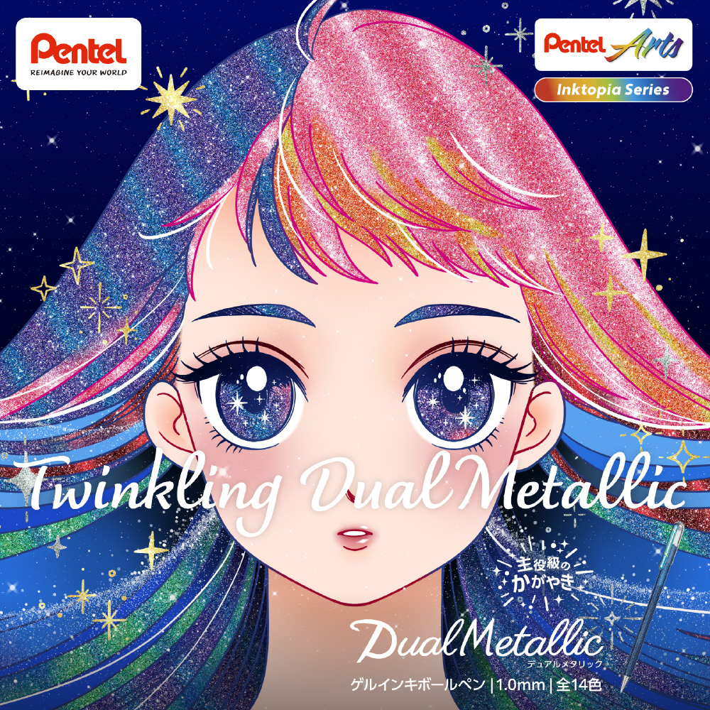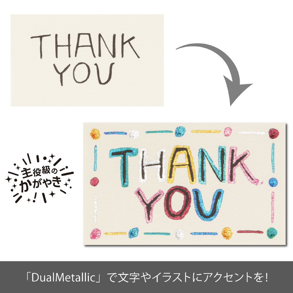 白い紙では鮮やかに、黒などの濃く深い色の紙ではグリッターの輝きがきわだち幻想的に、1本で多彩な表現をお楽しみいただけます。