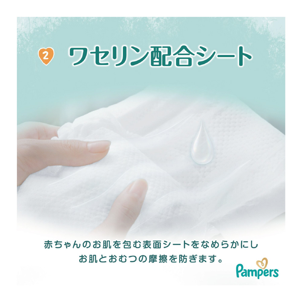 ワセリン配合シート 赤ちゃんの肌を包む表面シートをなめらかに。お肌とおむつの摩擦を防ぎます。素早く引き込む吸収力 スッと吸収、さらっとキープ。