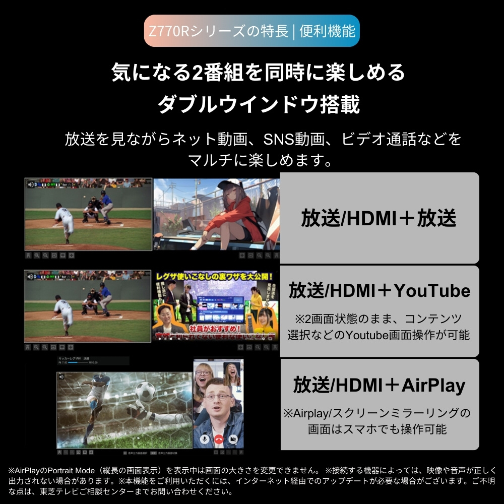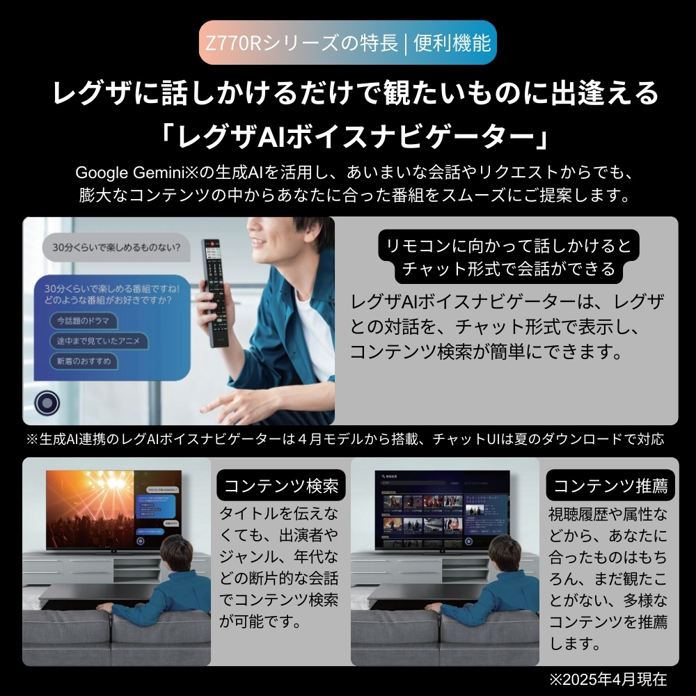 インテリジェンスのAI技術が誘う、新たな視聴体験。大きな感動をもっと身近に、より楽しみやすく。大画面レグザの新スタンダード。