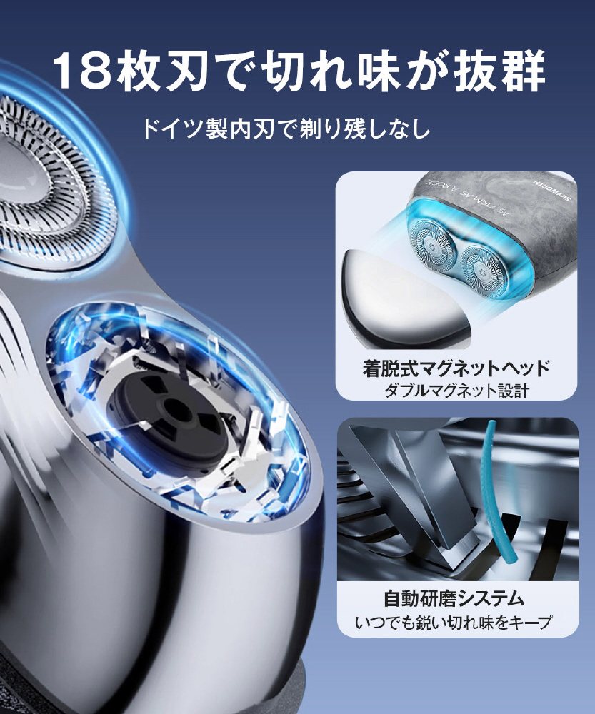 浮動ダブルリングの刃とステンレス製網刃設計により、肌に優しく自然な剃り心地を提供。肌への負担を最小限に抑えます。