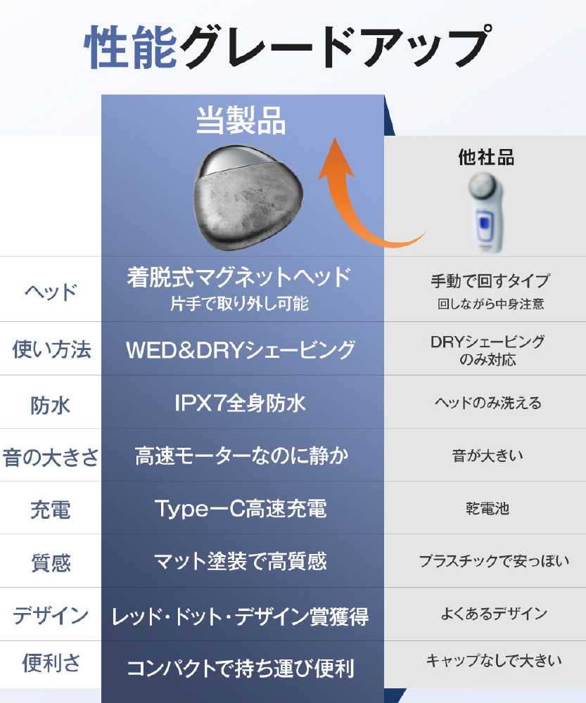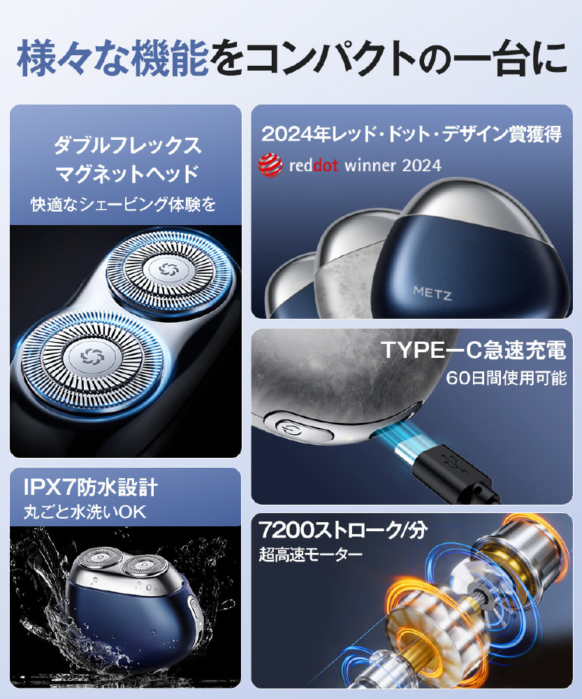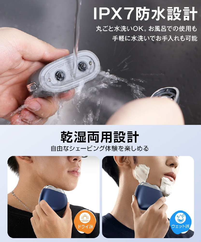 IPX7級の防水機能により、シェーバー全体を水洗いでき、いつも清潔に保つことができます。ウェットシェービング・ドライシェービング両方に対応しており、シーズンやお肌の状態に合わせた使い分けが可能です。