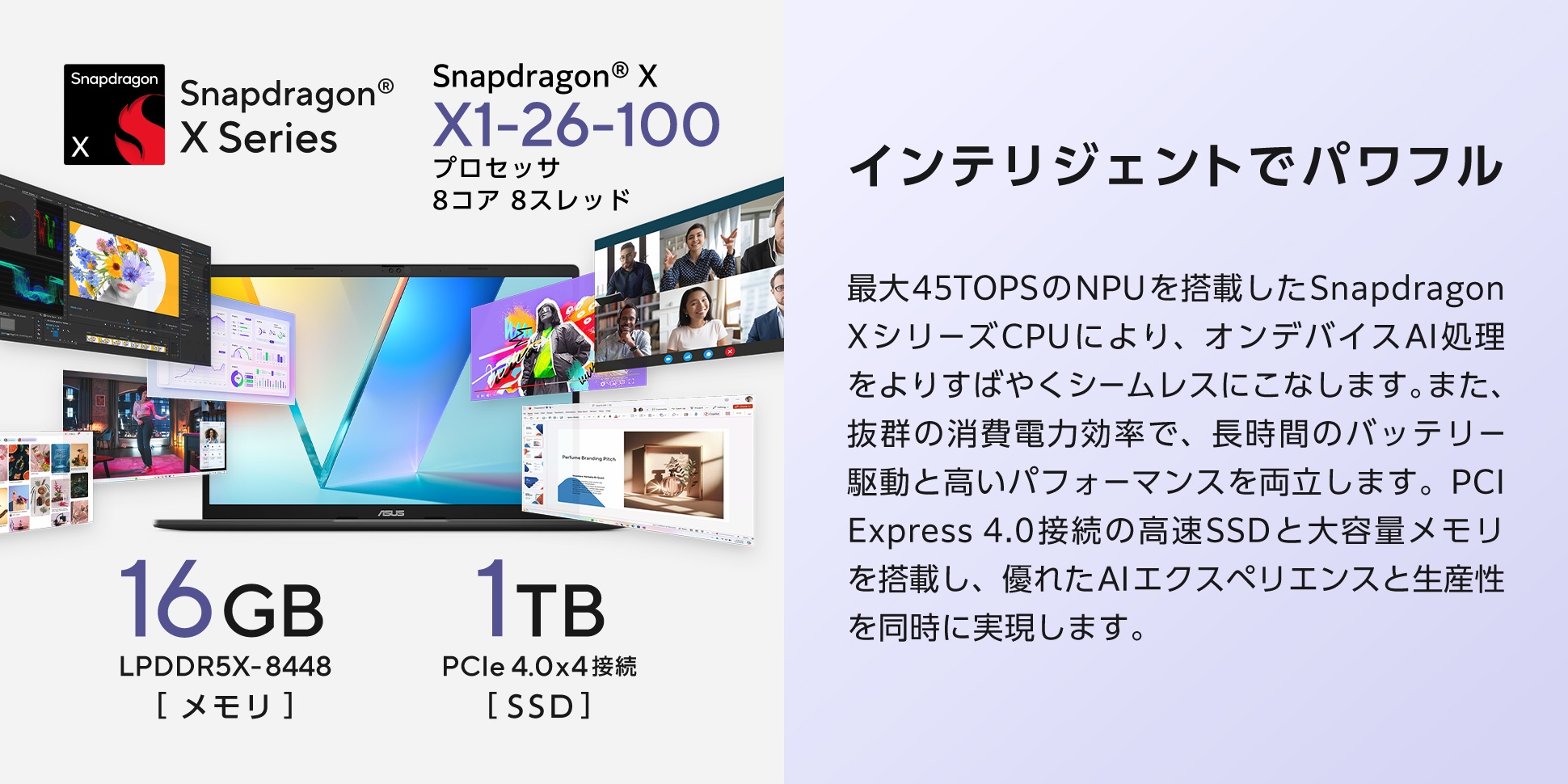マックス45TOPSのNPUを搭載したSnapdragon XシリーズCPUにより、オンデバイスAI処理をよりすばやくシームレスにこなします。PCI Express 4.0接続の高速SSDと大容量メモリを搭載し、優れたAIエクスペリエンスと生産性を同時に実現します。