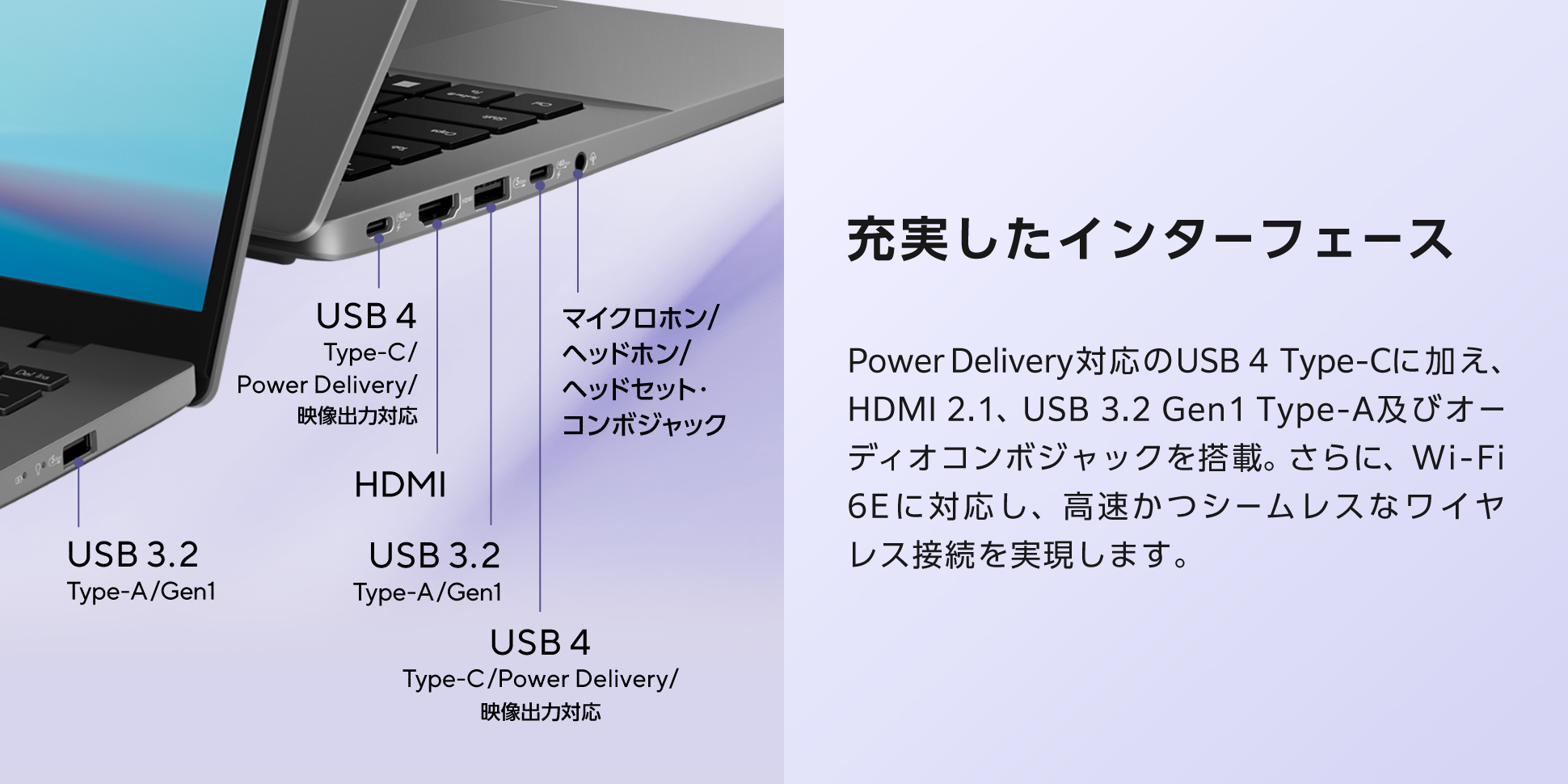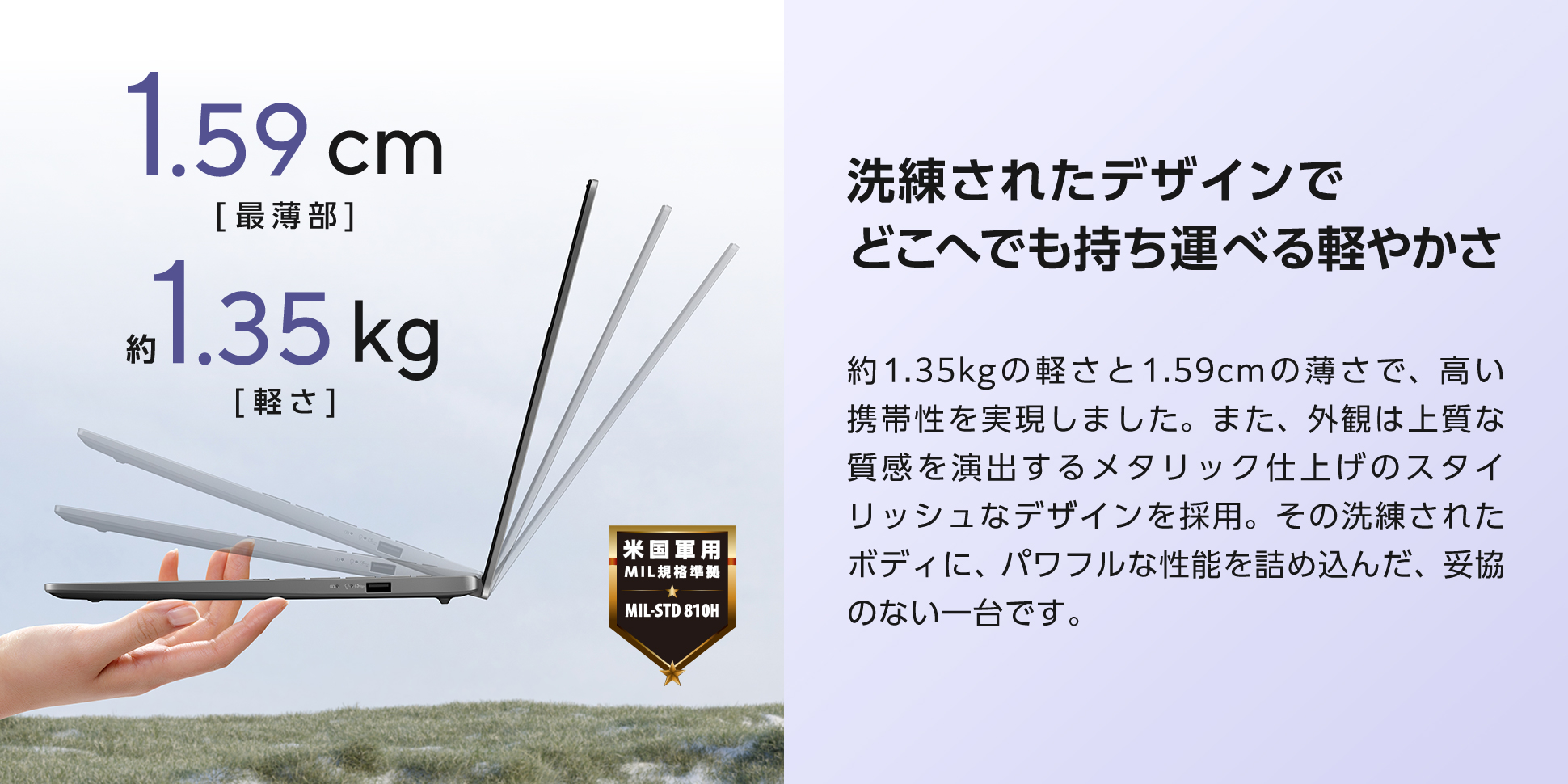約1.35kgの軽さと1.59cmの薄さで、高い携帯性を実現しました。また、外観は上質な質感を演出するメタリック仕上げのスタイリッシュなデザインを採用。その洗練されたボディに、パワフルな性能を詰め込んだ、妥協のない一台です。?