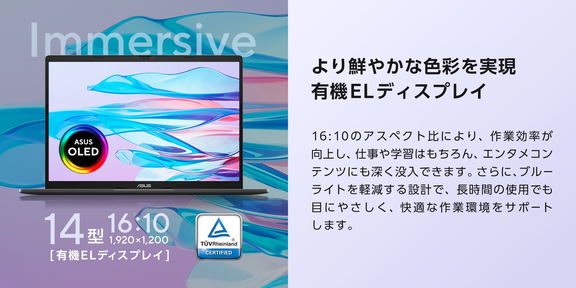 16:10のアスペクト比により、作業効率が向上し、仕事や学習はもちろん、エンタメコンテンツにも深く没入できます。さらに、ブルーライトを軽減する設計で、長時間の使用でも目にやさしく、快適な作業環境をサポートします。
