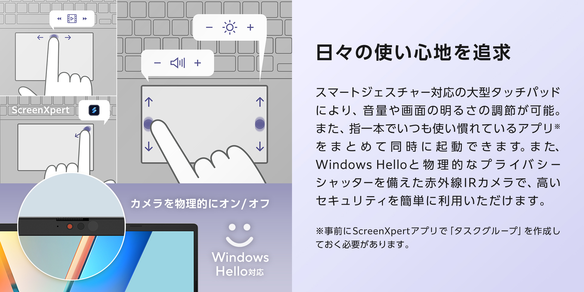 スマートジェスチャー対応の大型タッチパッドにより、音量や画面の明るさの調節が可能。また、指一本でいつも使い慣れているアプリ※をまとめて同時に起動できます。また、Windows Helloと物理的なプライバシーシャッターを備えた赤外線IRカメラで、高いセキュリティを簡単に利用いただけます。