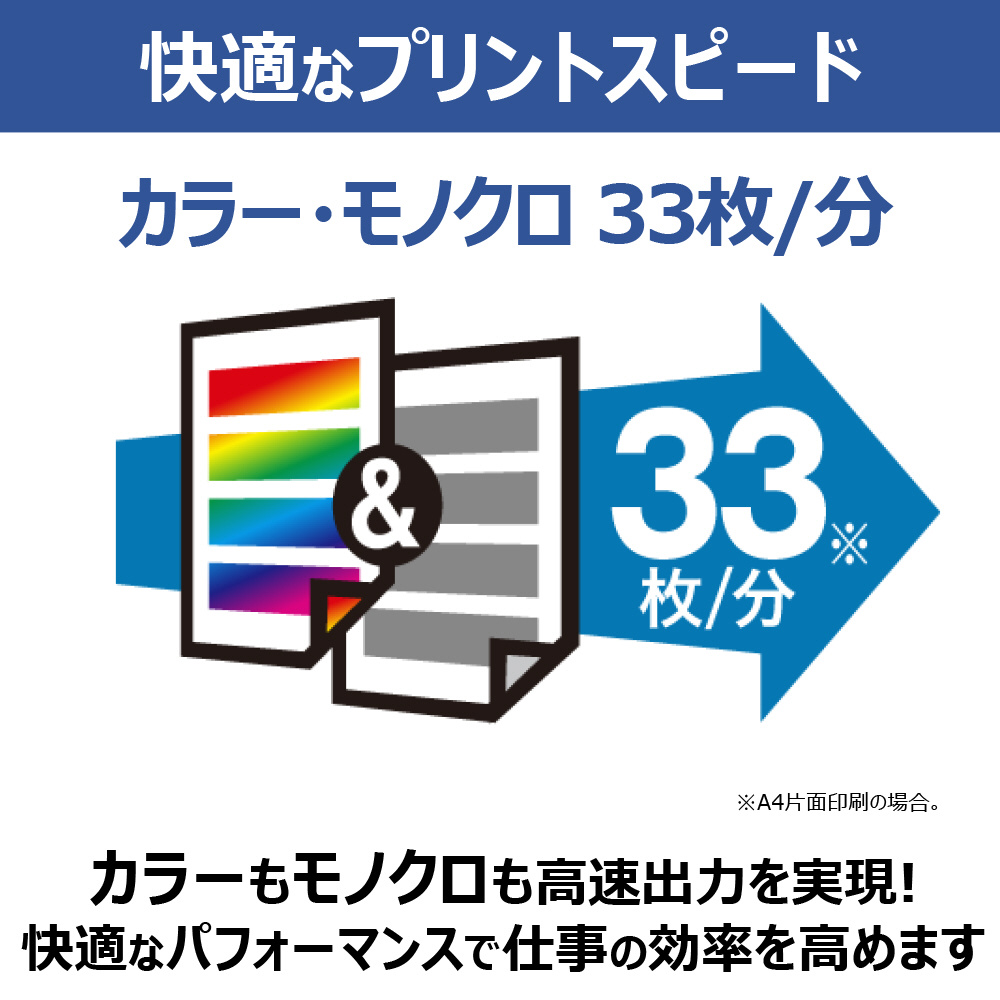 カラー・モノクロともに毎分33枚※の連続出力を実現。さらに、スリープモードからのリカバリータイムを短縮し、急ぎの出力にも速やかに対応します。