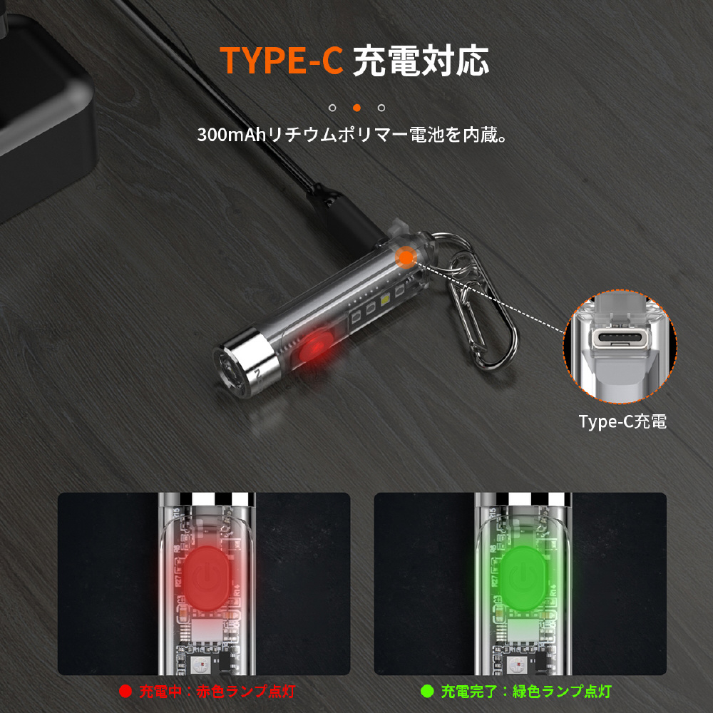 ●明るさ4段階調整可能。●最大400LM●通常の白色ライトのほか、RGB色、UVAライト搭載。●ワンキー式スイッチで片手操作およびモード切替が簡単です。●Type-C充電に対応しています。●スマートスイッチ搭載でバッテリー残量表示機能付き。充電中は赤色ライト点灯、充電完了時は緑色ライト点灯します。●キーチェーン付属で持ち運びに便利です。●動作温度範囲は-20°C~50°Cです。