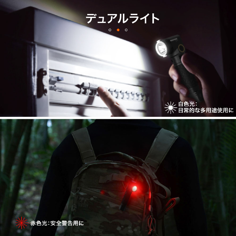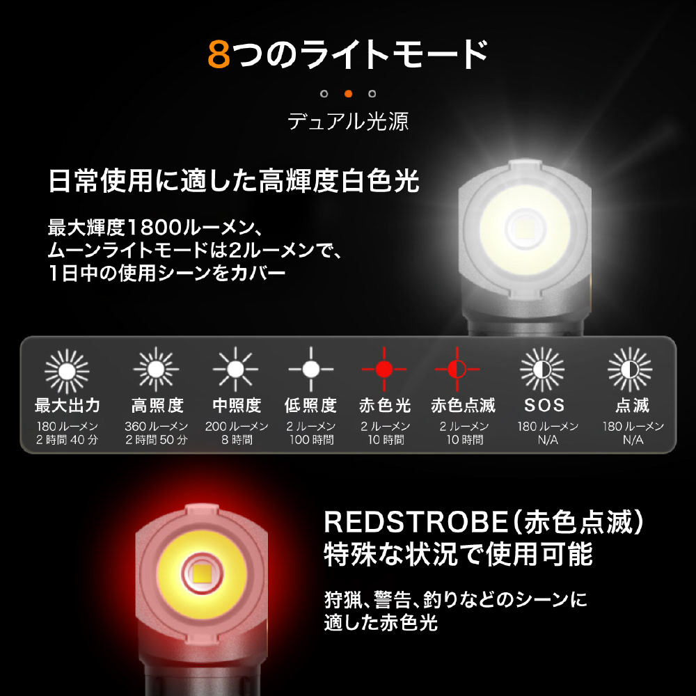 ●明るさ4段階調整可能。●最大1000LM●レッドライト付き●点滅、SOSモード付き●タイプC充電口付き。●充電中は押しボタンのインジケーターが赤色、満充電で緑色に点灯します。
