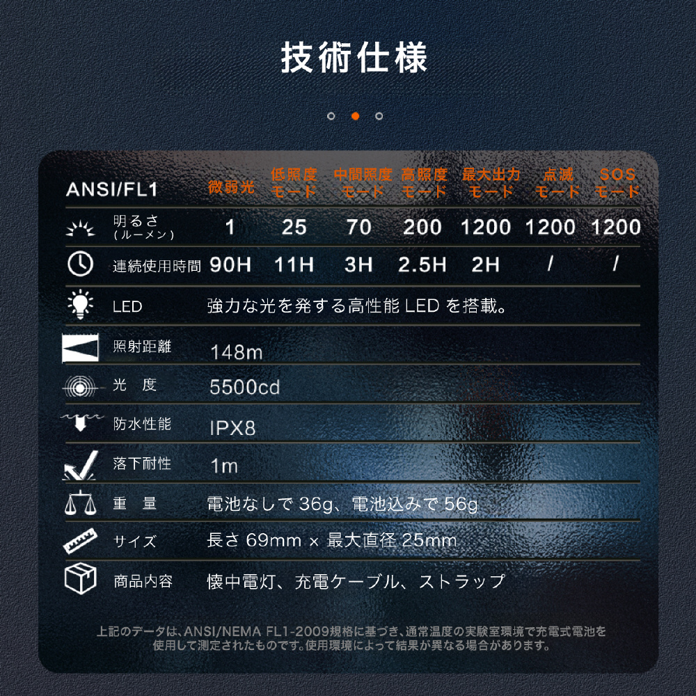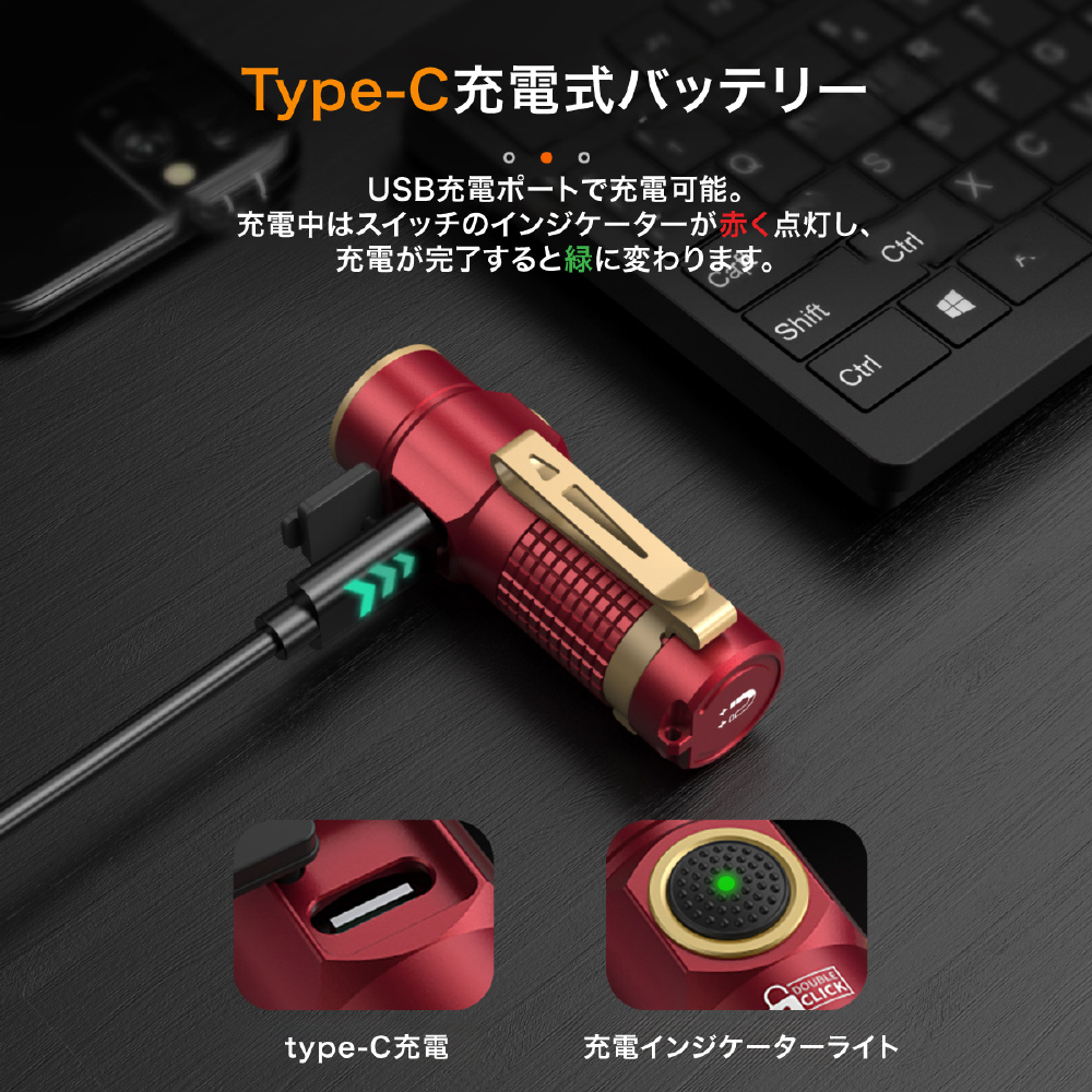 ●明るさ5段階調整可能。●最大1200LM ●高級アルミ合金製ボディを採用し、上質なアルマイトコーティングが施されています。●回転式スイッチを採用し、片手で簡単に操作・モード切替が可能です。●タイプC充電口付き、5V出力のスマートフォン用充電器に対応しています。●充電中は押ボタン部分のインジケーターが赤色、満充電になると緑色に点灯します。●過充電・過放電防止回路および短絡保護システムを備えたリチウムイオン電池により、常に安全に使用できます。●高品質なキーチェーン付きで、持ち運びにも便利です。●使用温度範囲:-20°C ~ 50°C●保管温度範囲:-20°C ~ 70°C