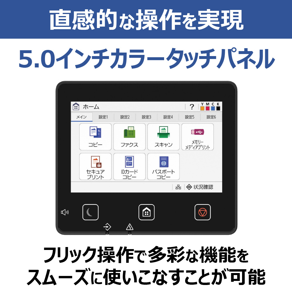 熱伝導効率の高い定着フィルムと、定着部分を瞬時に加熱するセラミックヒーターを採用し、予熱がいらない省エネ構造と、スリープからスピーディーに復帰するクイックウェイクアップを両立。すぐに印刷を開始し、ビジネスを効率化します。