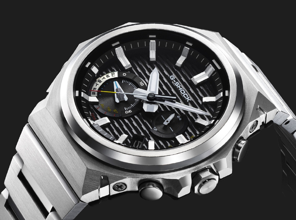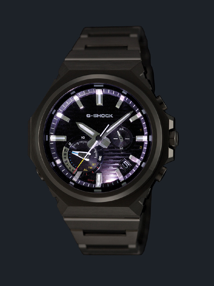 G-SHOCK初号機“DW-5000C”から継承したベゼルデザインやレンガパターンが、ドレッシーな装いの中にスポーティさを加えています。