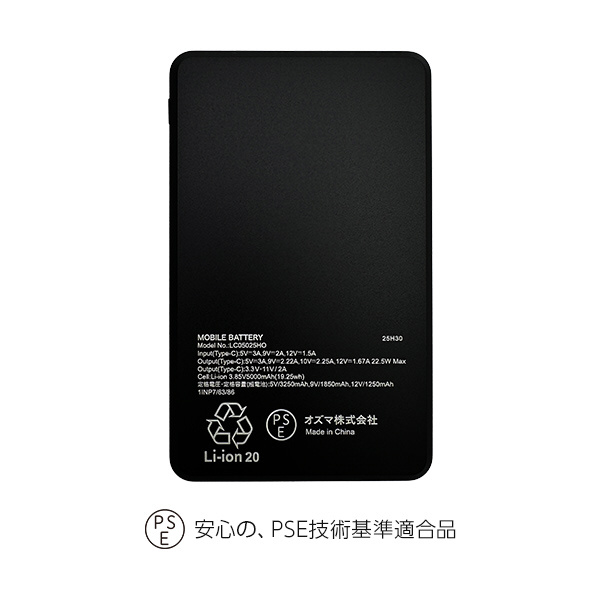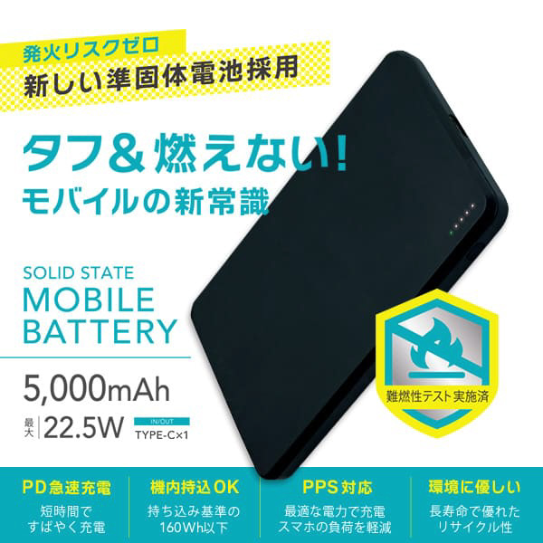 | 商品名 | 準固体モバイルバッテリー 5000mAh 22.5W ブラック ブラック SSLCM50-CCBK [USB Power Delivery対応 /1ポート] |
