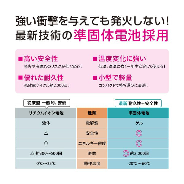 準固体電池を採用した安全性の高い長寿命モバイルバッテリーです。