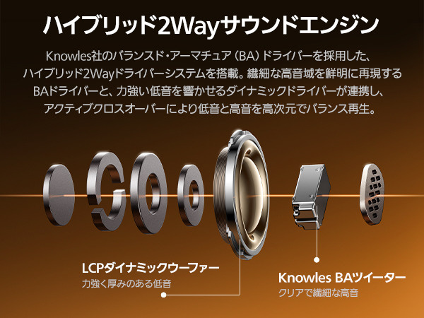 先進のBA(バランスド・アーマチュア)技術で知られるKnowles社製の高性能ツイーターと、