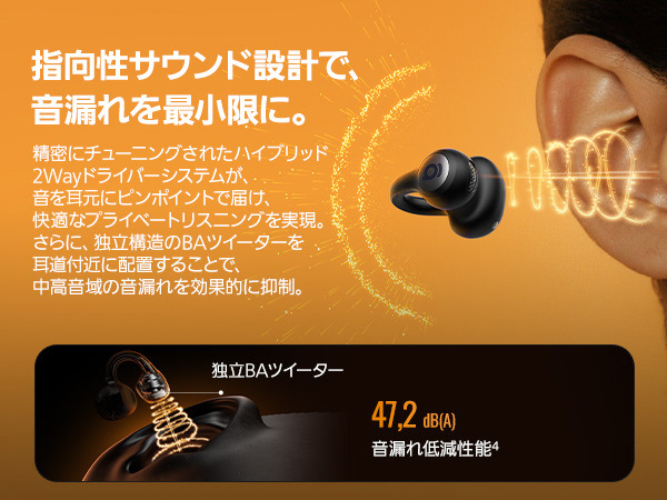 独立構造のBAツイーターを耳道付近に配置することで、中高音域の音漏れを効果的に抑制。