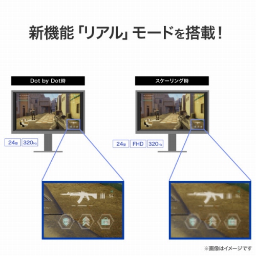 これまで対応していたスケーリング機能に加えて、新たにリアル(Dot by Dot)表示に対応しました!リアル(Dot by Dot)表示を選択することにより、24型相当の表示でも画素がつぶれず、映像本来の精細さを保ったまま表示できます。もちろん、PS5など解像度固定の機器では、従来通りスケーリング機能でFocus Modeを使用可能。幅広いデバイスで快適なプレイが可能です。