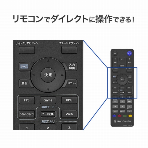 本商品の入力切換や音量の調節などをはじめ、ゲームのジャンルにあわせたモードの選択や下記のような各種機能のON/OFFなども簡単に設定できます。よく使う機能の操作ボタンを使いやすい位置に配置したこだわりのリモコンです。