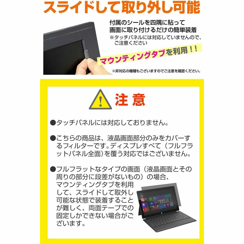・フルフラットなタイプの画面(液晶画面とその周りの部分に段差がないもの)の場合、マウンティングタブを利用して、スライドして取外し可能な状態で装着することが難しく、両面テープでの固定しかできない場合がございます。