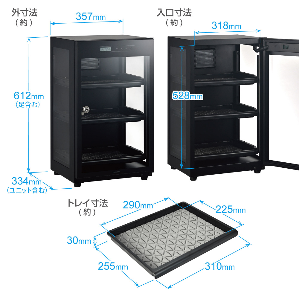 | 付属品 | 棚マット(3枚)、棚トレイ(3枚)、棚受け(6本)、棚トレイ固定ネジ(6本)、六角レンチ、ACアダプター、アジャスター足、鍵(2個)、70周年キーホルダー、取扱説明書 |