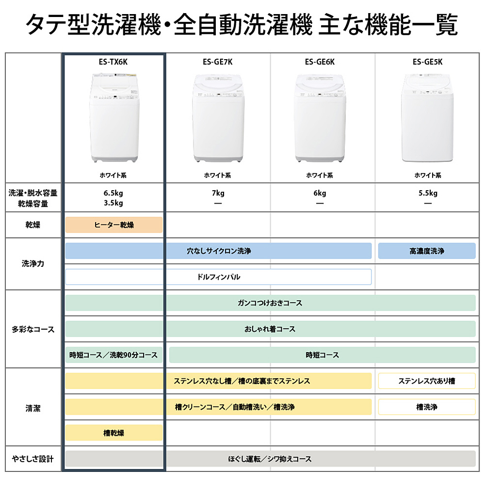 | 商品名 | 縦型洗濯乾燥機 ホワイト系 ES-TX6K-W [洗濯6.5kg /乾燥3.5kg /上開き] |