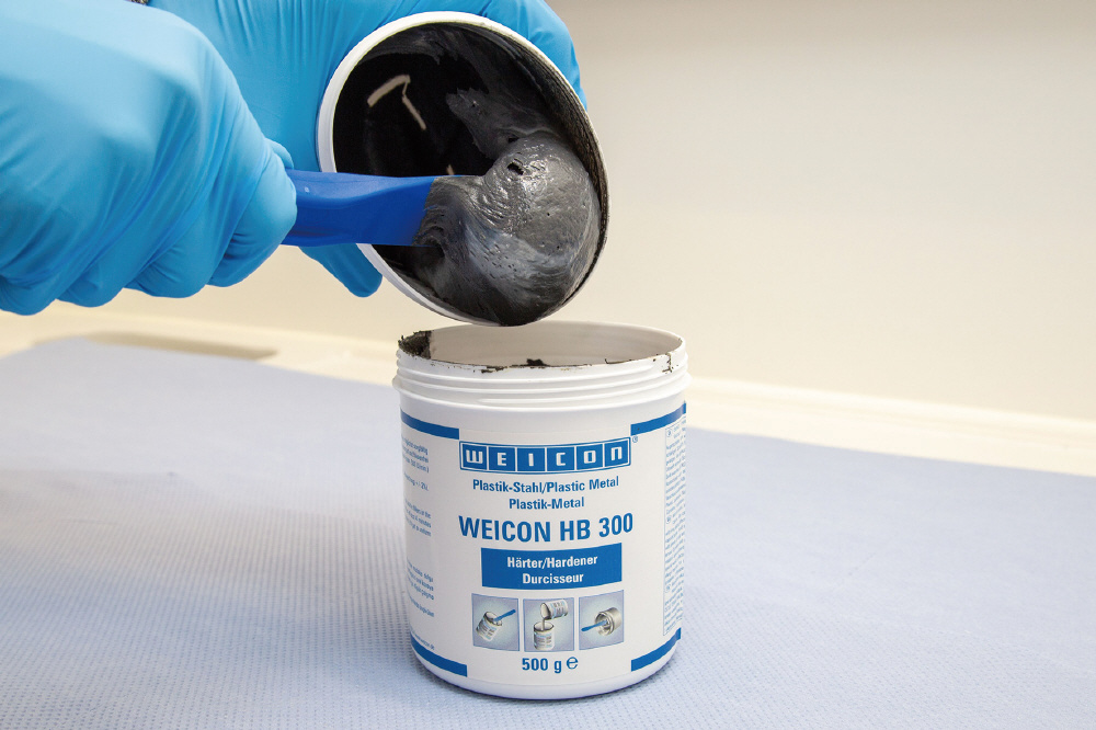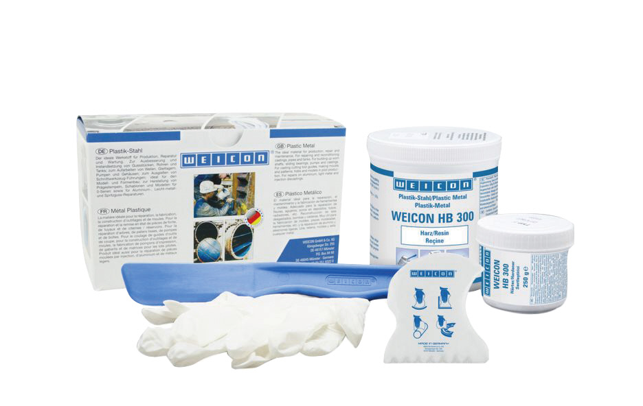 本製品を使用前に塗布する表面の脱脂や埃、錆、汚れを落としてください。平滑な面や特に汚れのひどい表面はさらに研磨工具を使用して表面前処理を行うことを推奨します。気泡なく均一に塗布されていることを確認してください。可使時間が30分の為、30分以内に処理できる量のバッチをご用意ください。薄いプレコートの場合 WEICON HB300を十字に集中的に塗布してください。ひび割れのギャップ、荒い表面へよく浸透させることが出来ます。
