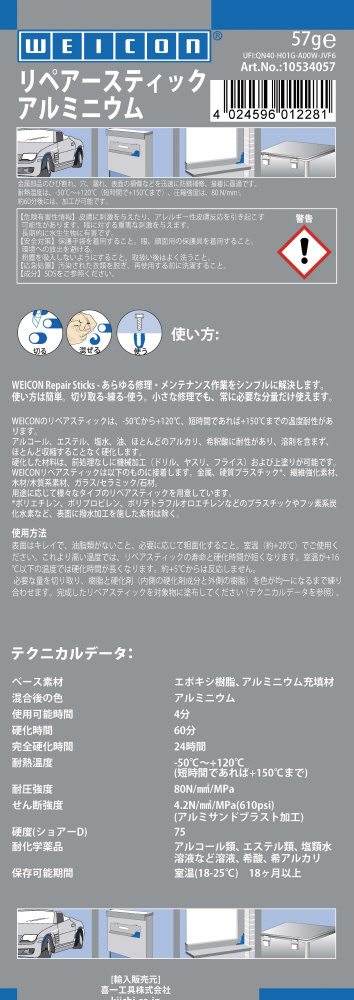 皮膚に刺激を与えたり、アレルギー性皮膚反応を引き起こす可能性があります。保護手袋を着用してください。眼に入ると大変危険で重篤な症状を引き起こす可能性があります。眼、顔面用の保護具を着用してください。水生生物に非常に強い毒性があり、長期継続的影響により有害物質となりますので、環境への放出は避けてください。粉塵を吸入しないようにし、取扱い後はよく洗ってください。衣服に付着した時は汚染された衣類を脱ぎ、再使用する前に洗濯してください。成分につきましてはSDSをご参照ください。表面をきれいにし、油分も取り除き、必要なら滑 り止めして下さい。室温(約20℃)でご使用ください。これより高い温度では、リペアスティックの寿命と硬化時間が短くなります。室温が16℃以下の温度では硬化に時間がかかります。5℃以下では硬化が止まります。