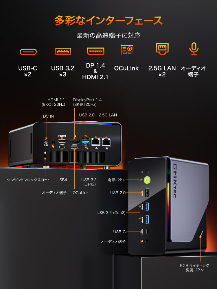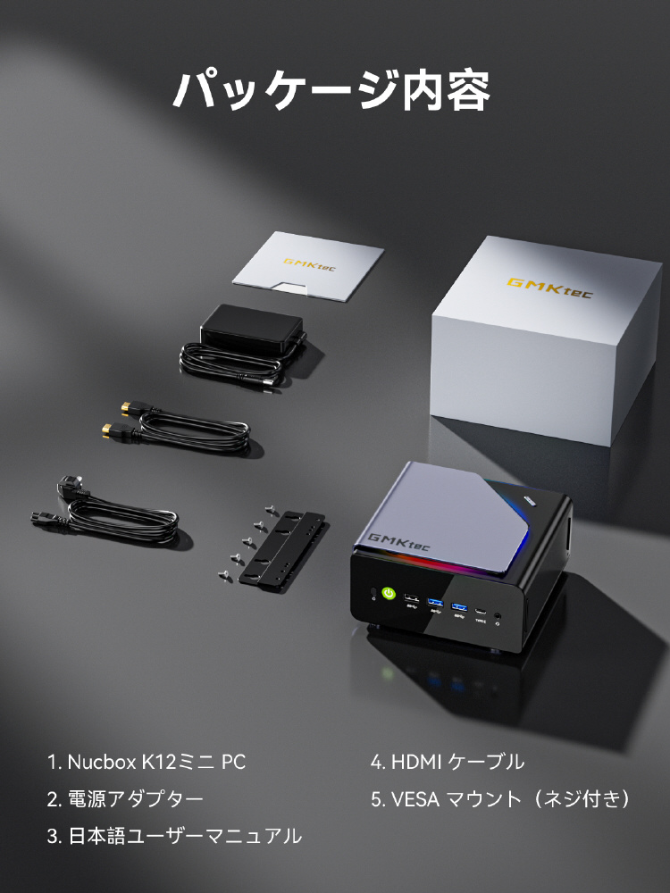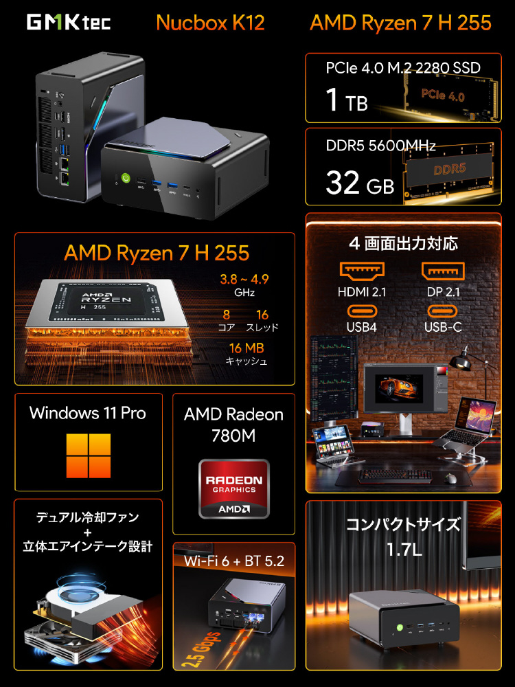 GMKtec NucBox K12は、AMD Ryzen 7 H255 を搭載した高性能ミニPCです。8コア16スレッド、最大4.9 GHz動作の高性能CPUと32 GBの大容量メインメモリ、1 TBのM.2 PCIe 4.0 高速SSDを搭載し、省スペース化だけでなくクリエイティブ用途やゲーミングに至るまで様々な用途に高いパフォーマンスを発揮します。