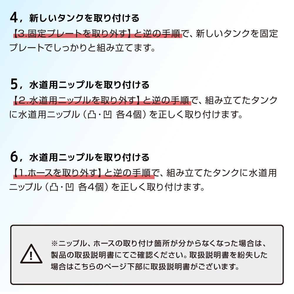| 仕様2 | 注意事項:※必ず4本すべてのタンクを同時に交換してください。 一部のみ交換すると、性能低下の原因となります。 以下の工具をご用意いただくと交換作業をスムーズに行えます。 ●水道用ニップル用:17mmの平型レンチ ●蝶ナット・ボルト用:14mmの平型レンチ ※水道用ニップルを取り外す際に、内部のゴムパッキンが外れる場合があります。紛失や取り付け忘れにご注意ください。 |