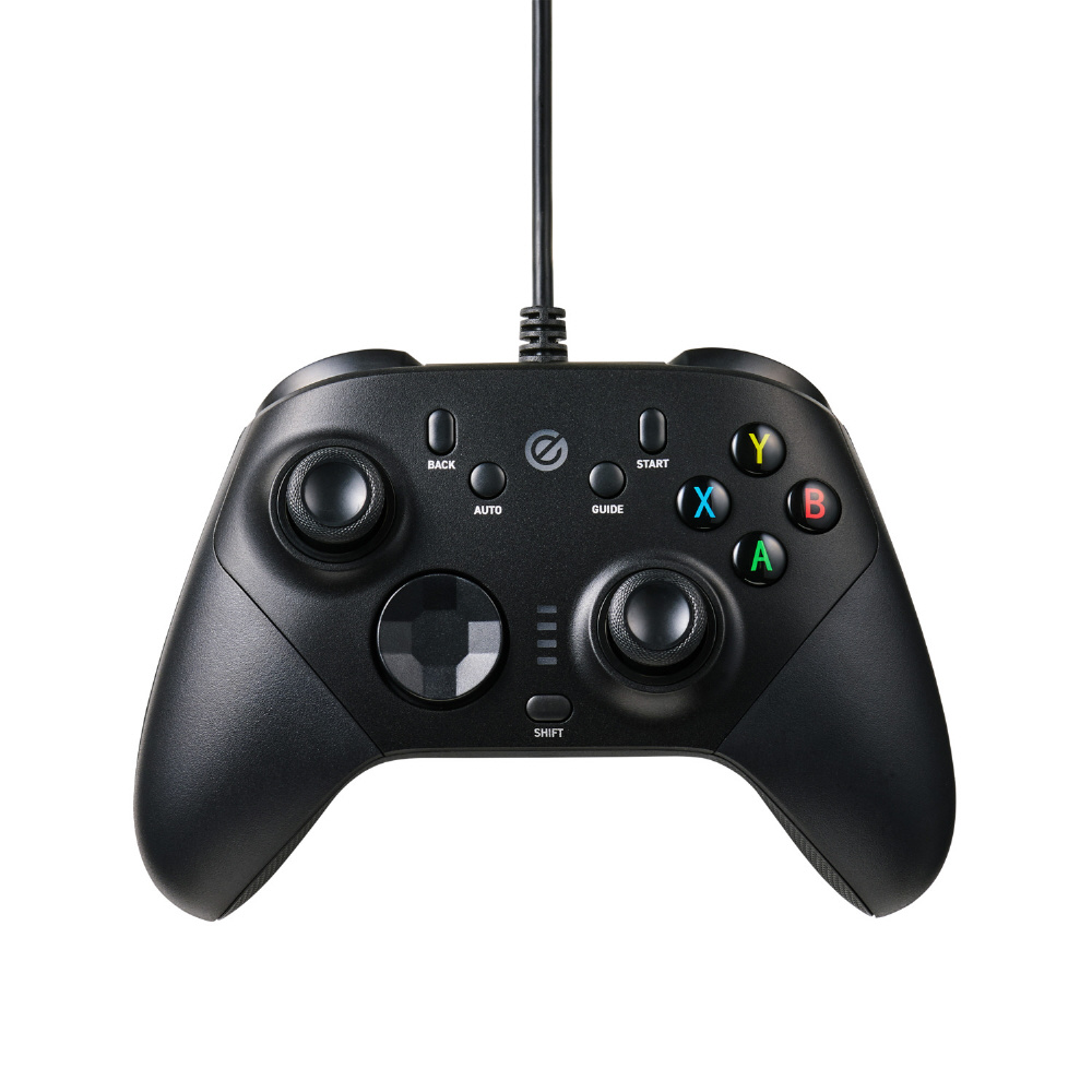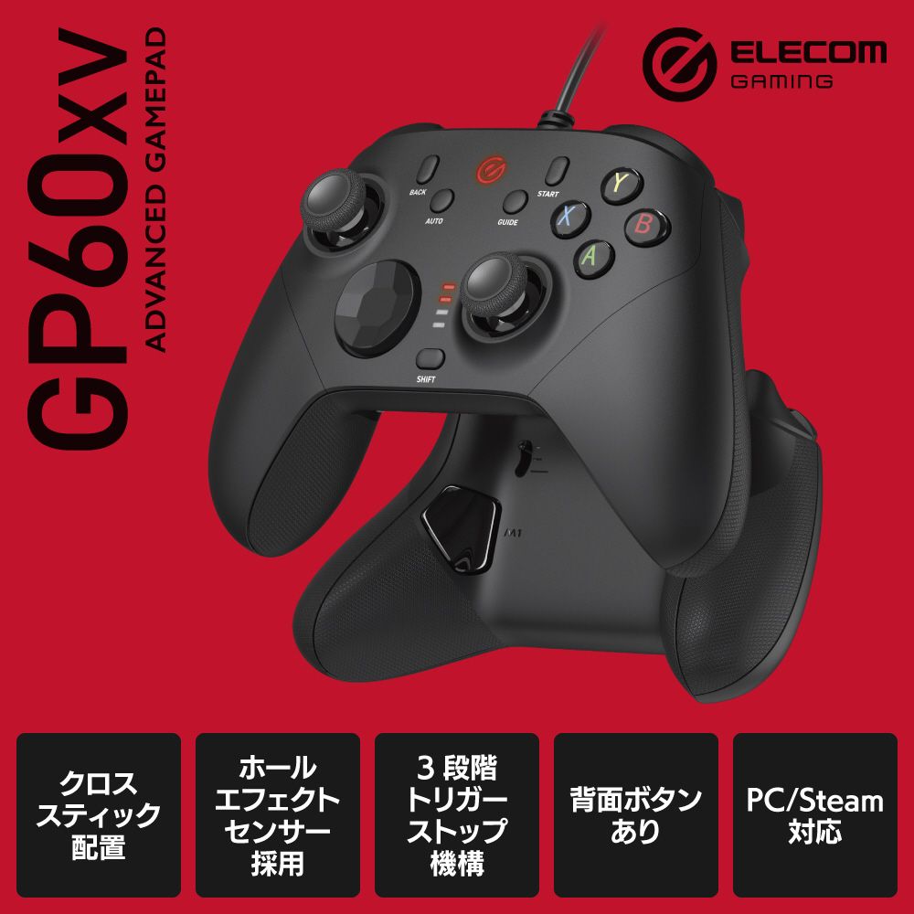 XInput/DirectInputの両方に対応した、多機能で高耐久な万能ゲームパッドです。スティックとトリガーにホールエフェクト技術を採用することで、高い耐久と優れた操作性を実現しています。さらに、背面ボタンの搭載により、複雑で高度な操作もスムーズに行えます。クロススティック配置(Xbox系)の有線振動対応ゲームパッドです。