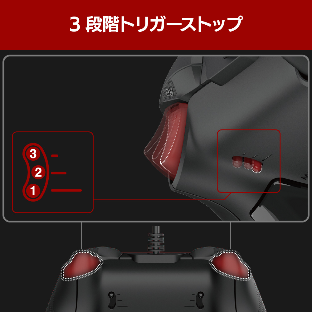 押し込み具合を3段階で切り替えできるトリガーストップ機構を採用したトリガーボタン。 レーシングゲームでは深いストローク、アクションゲームでは浅いストロークで連打など、ゲームジャンルに応じて最適な操作感を選べます。