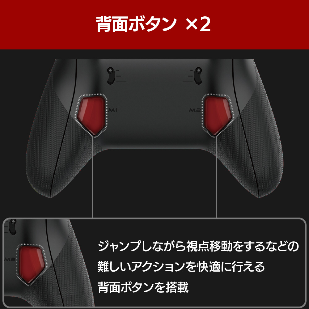 ジャンプしながら視点を移動するなど、難しいアクションも快適に行える2つの背面ボタンを搭載しています。 背面ボタンには、START/BACK/GUIDE以外のボタンの機能割り当てが可能です。また、同時押しにも対応しています。