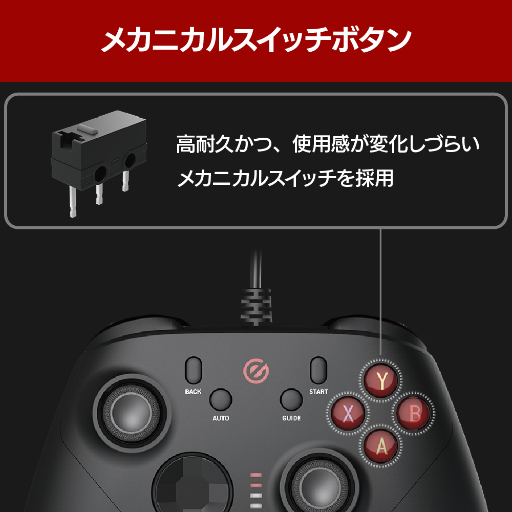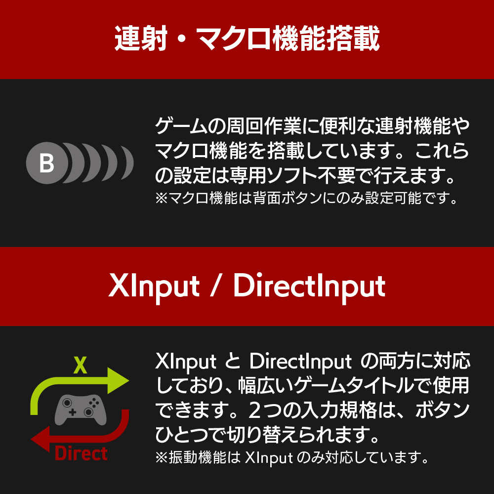 XInputとDirectInputの両方に対応しており、幅広いゲームタイトルで使用できます。 2つの入力規格は、ボタンひとつで切り替えられます。