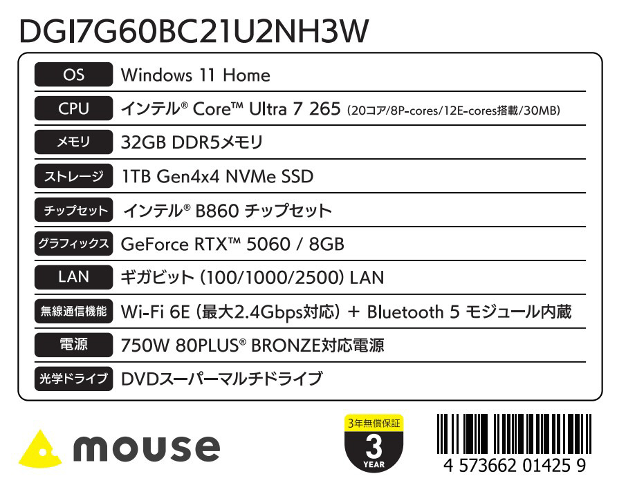 DGI7G60BC21U2NH3W ゲーミングデスクトップパソコン G TUNE(RTX 5060) ホワイト [モニター無し /Windows11 Home /intel Core Ultra 7 /メモリ:32GB /SSD:1TB /無し]