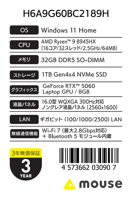 H6A9G60BC2189H ゲーミングノートパソコン G TUNE(RTX 5060) ブラック [16.0型 /Windows11 Home /AMD Ryzen 9 /メモリ:32GB /SSD:1TB /日本語版キーボード]