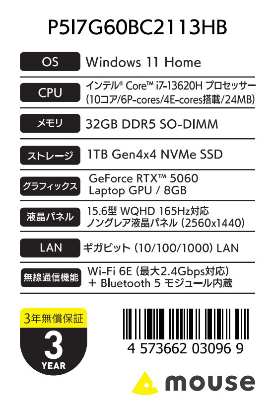 P5I7G60BC2113HB ゲーミングノートパソコン G TUNE(RTX 5060) ブラック [15.6型 /Windows11 Home /intel Core i7 /メモリ:32GB /SSD:1TB /日本語版キーボード]